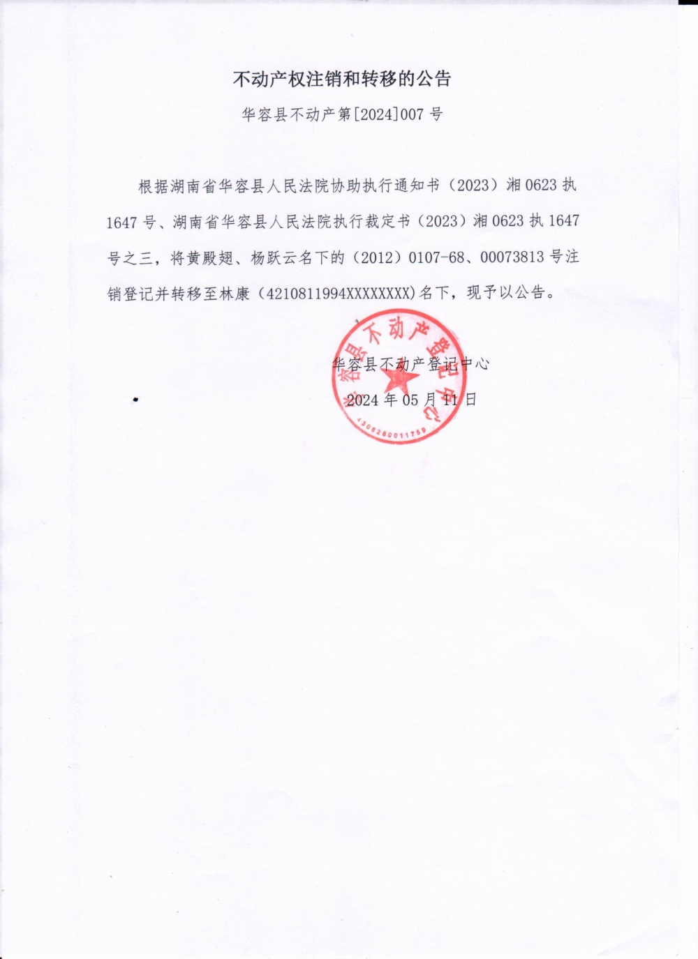 不动产权注销和转移的公告(黄殿翅、杨跃云转林康)