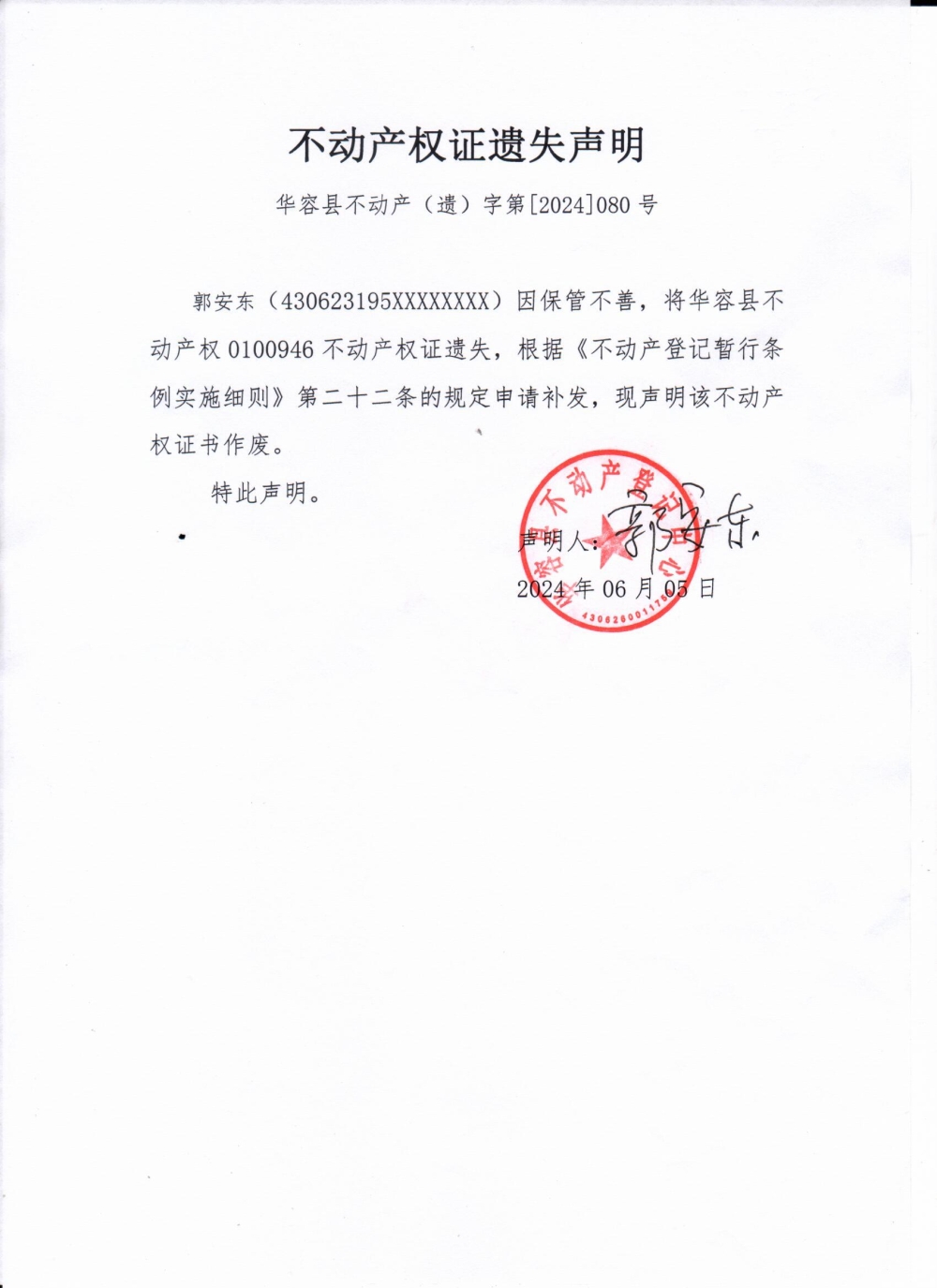 不动产权证遗失声明(郭安东)