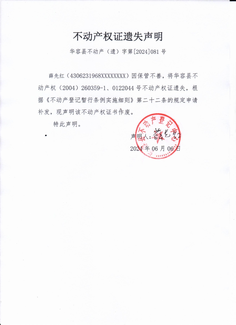 不动产权证遗失声明(薛先红)