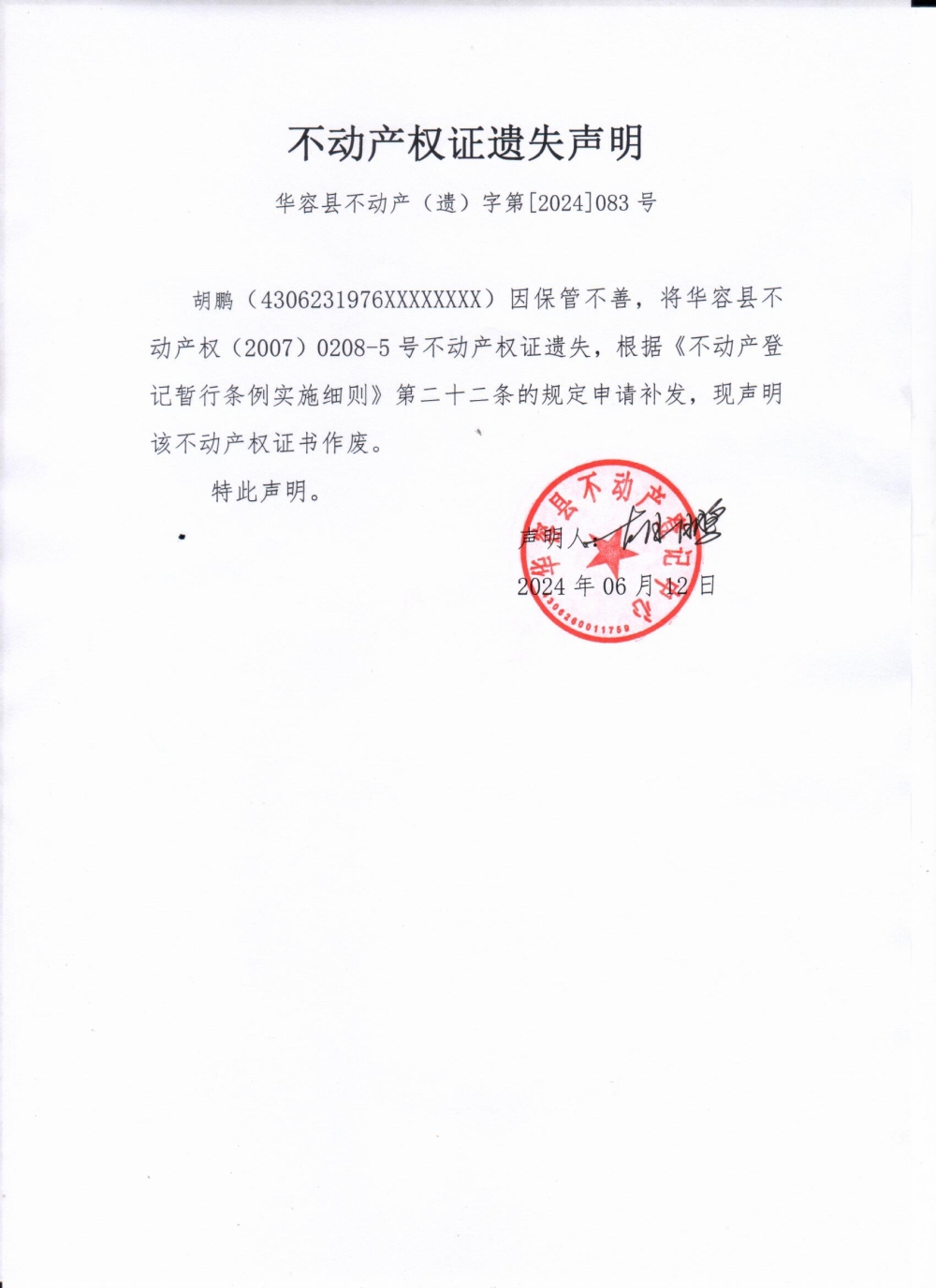 不动产权证遗失声明(胡鹏)