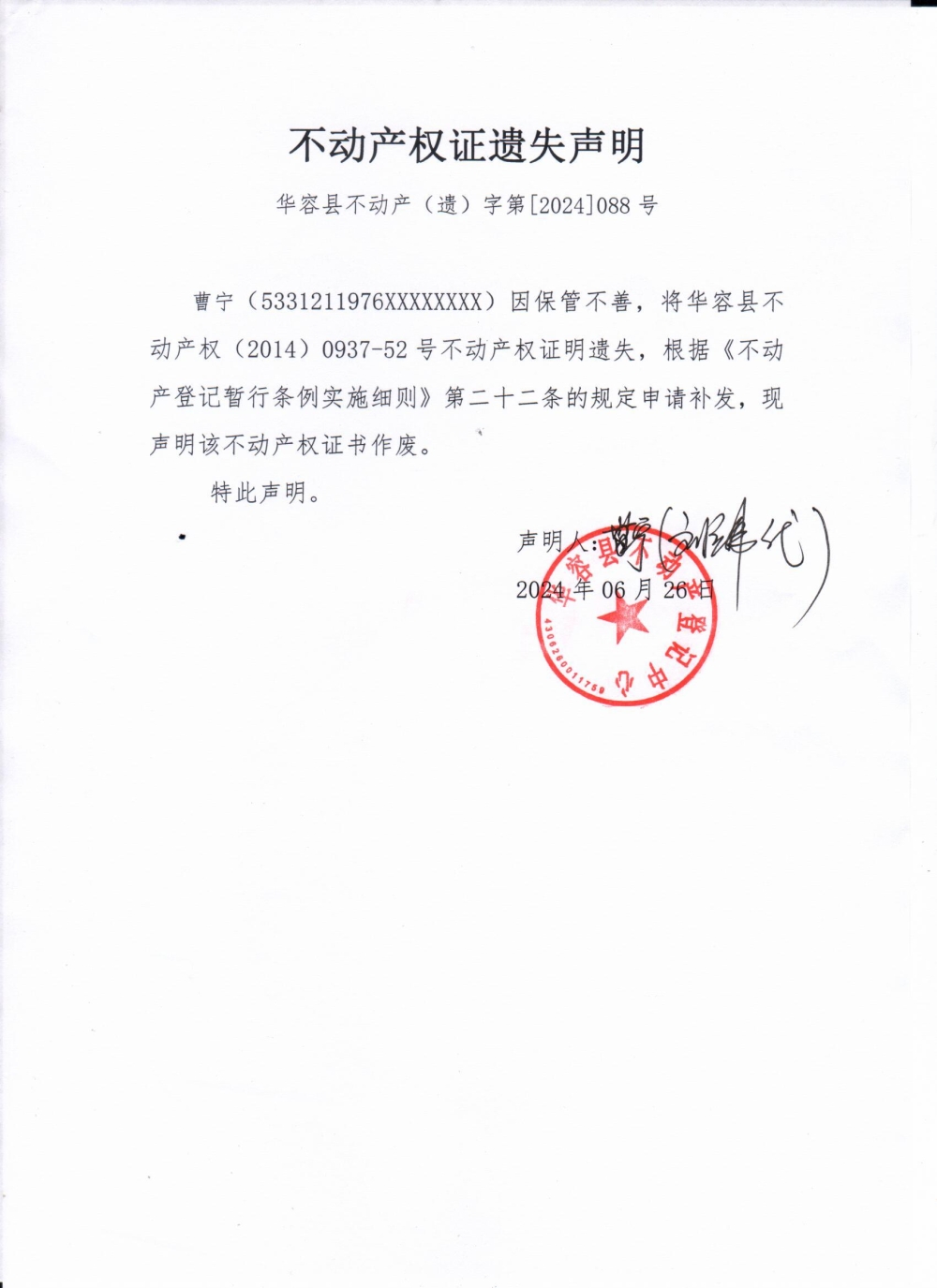 不动产权证遗失声明(曹宁)