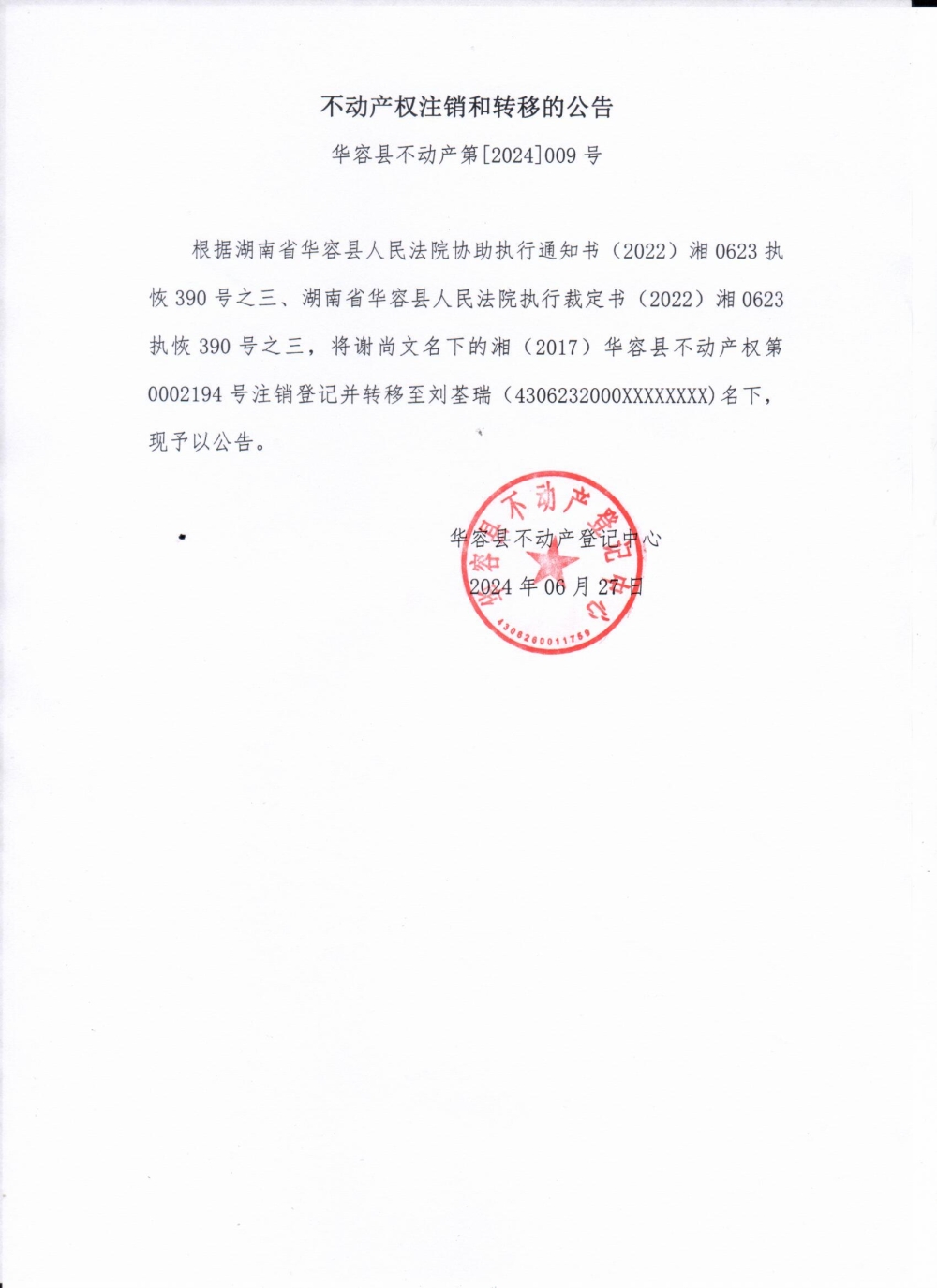 不动产权注销和转移的公告(谢尚文转刘荃瑞)