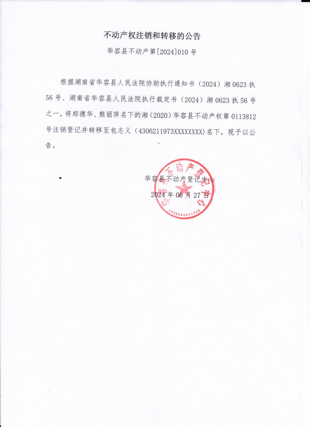 不动产权注销和转移的公告(郑德华、熊丽萍转包志义)