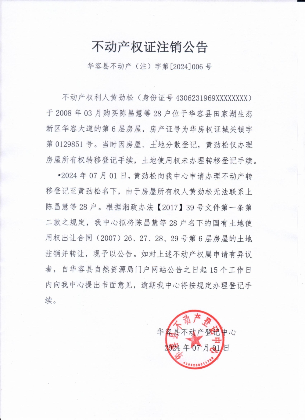 不动产权证注销公告(陈昌慧等28户转黄劲松)