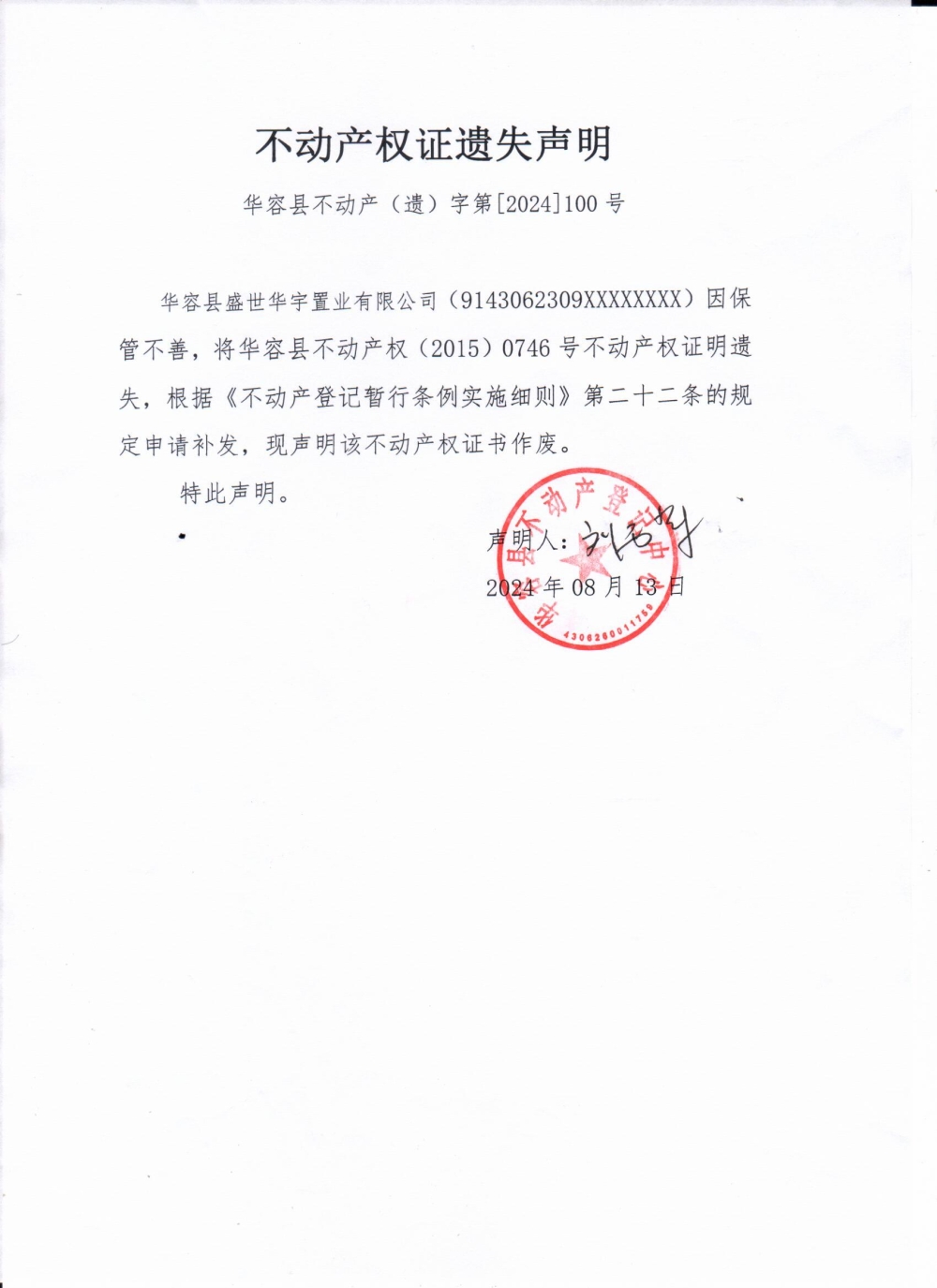 不动产权遗失声明(华容想盛世华宇置业有限公司)