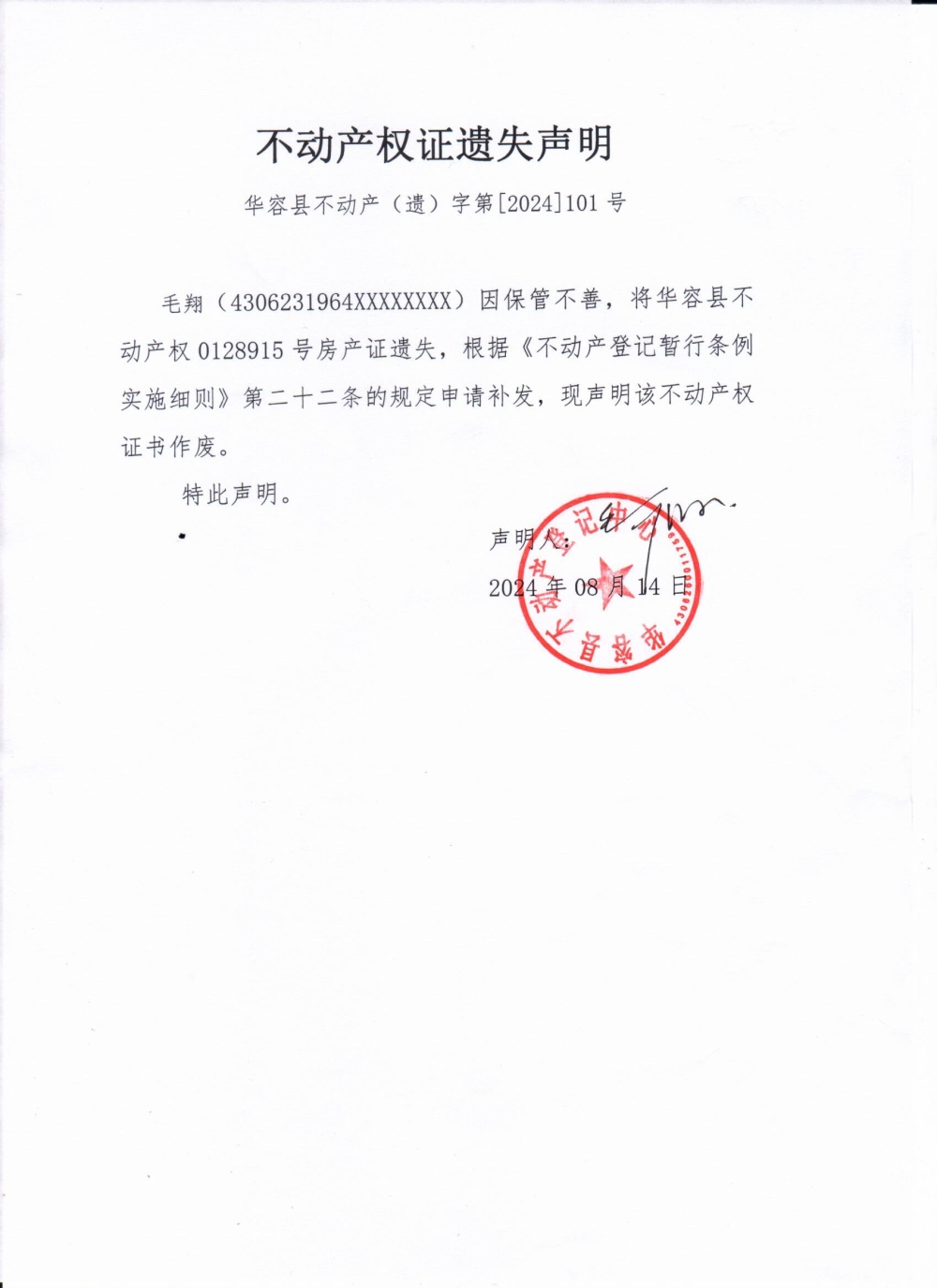 不动产权证遗失声明(毛翔)