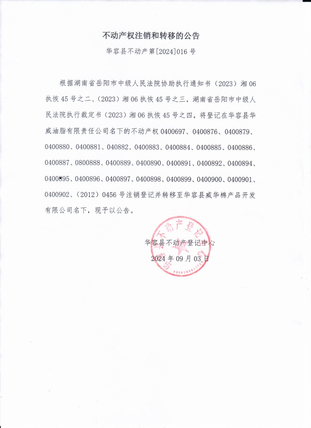 不动产权注销和转移的公告(华容县华威油脂有限责任公司转华容县威华棉产品开发有限公司)