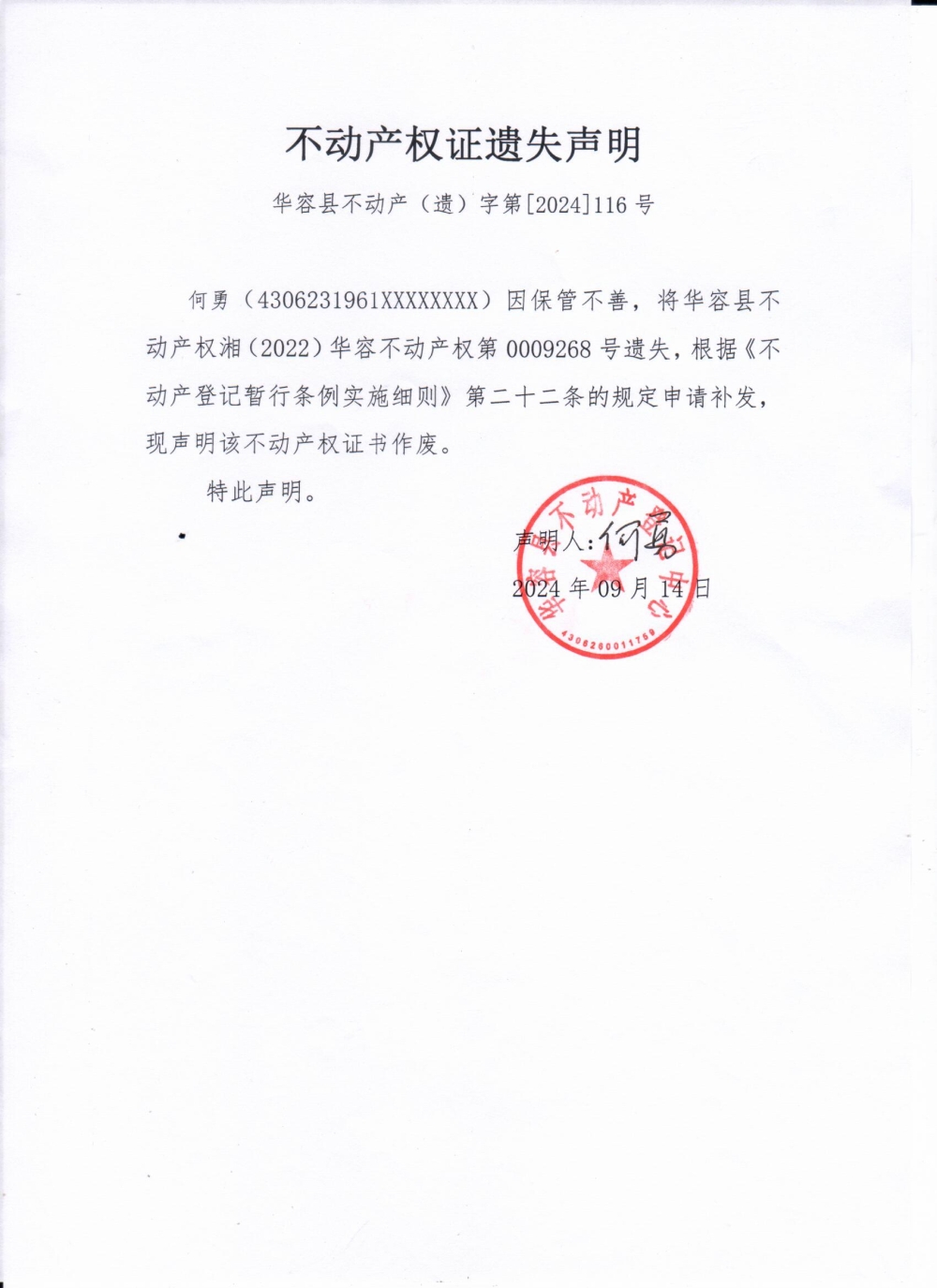 不动产权证遗失声明(何勇)