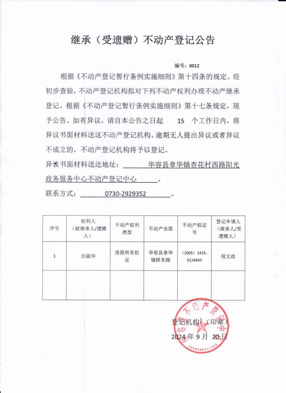 继承(受遗赠)不动产登记公告(白淑华转倪文政)