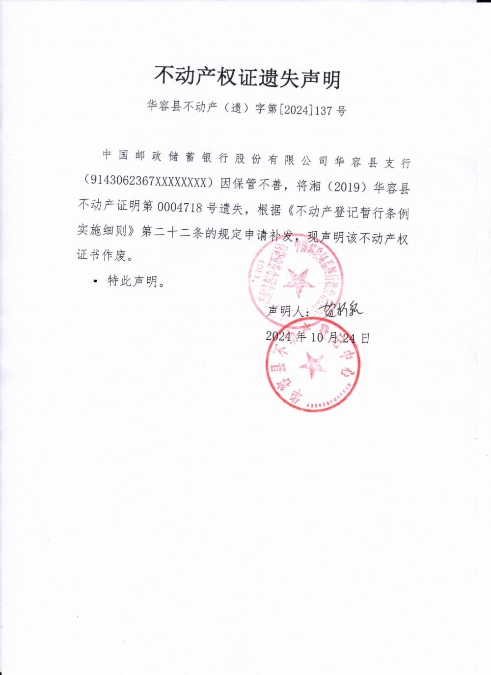 不动产权证遗失声明(中国邮政储蓄银行股份有限公司华容支行/贺新颖)