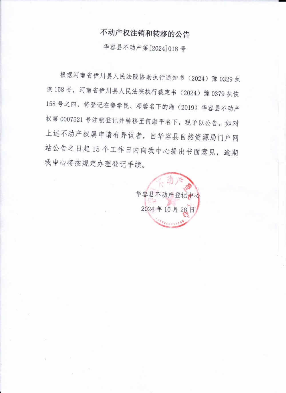 不动产权注销和转移的公告(鲁学民、邓蓉转何淑平)