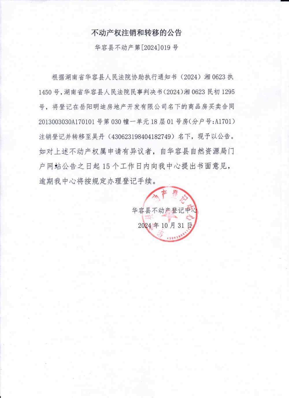 不动产权注销和转移的公告(岳阳明迪房地产开发有限公司转吴丹)