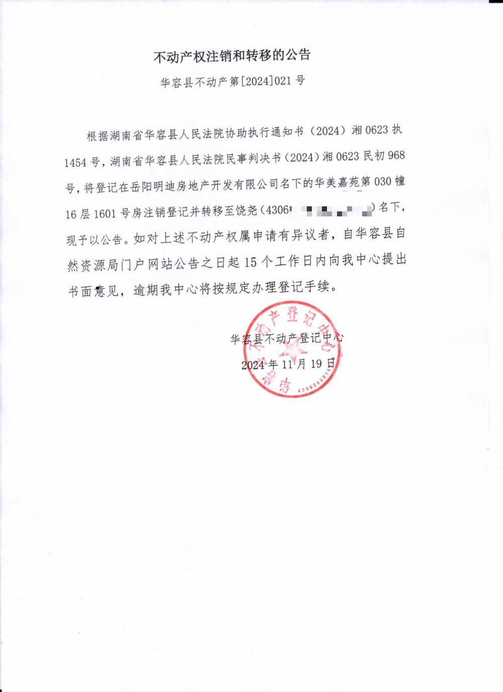 不动产权注销和转移的公告(岳阳明迪房地产开发有限公司转饶尧)