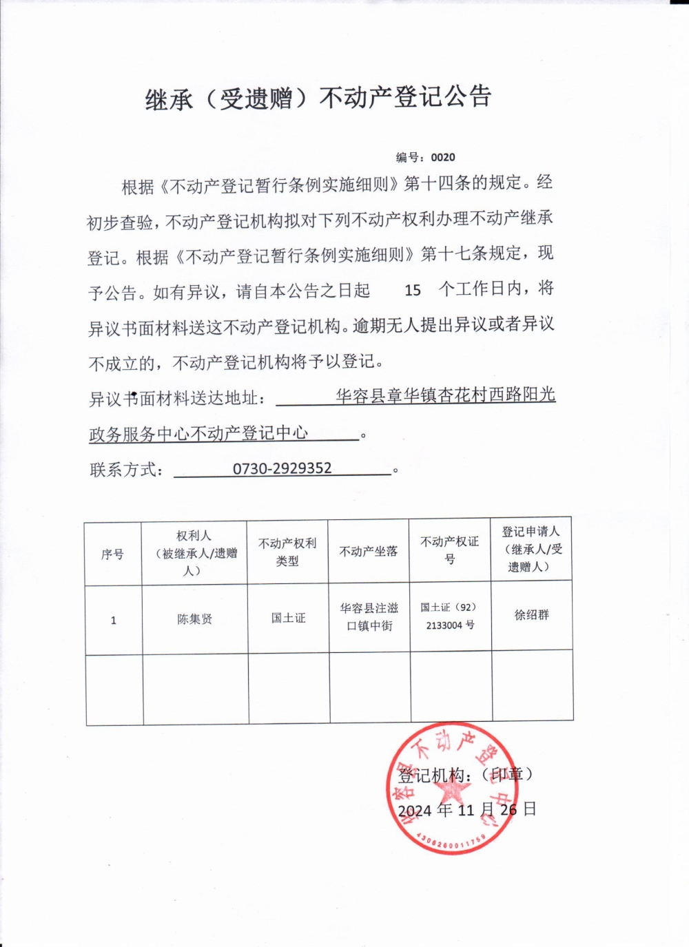 继承(受遗赠)不动产登记公告(陈集贤转徐绍群)