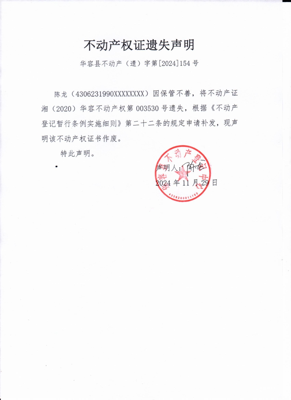 不动产权证遗失声明(陈龙)