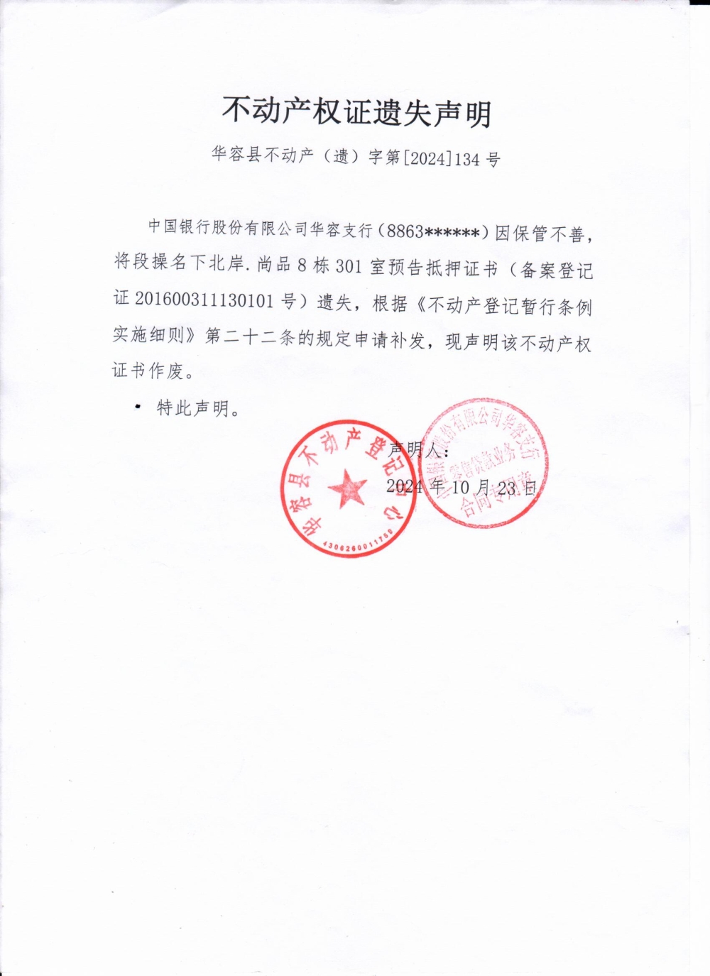 不动产权证遗失声明(中国银行股份有限公司华容支行、段操)