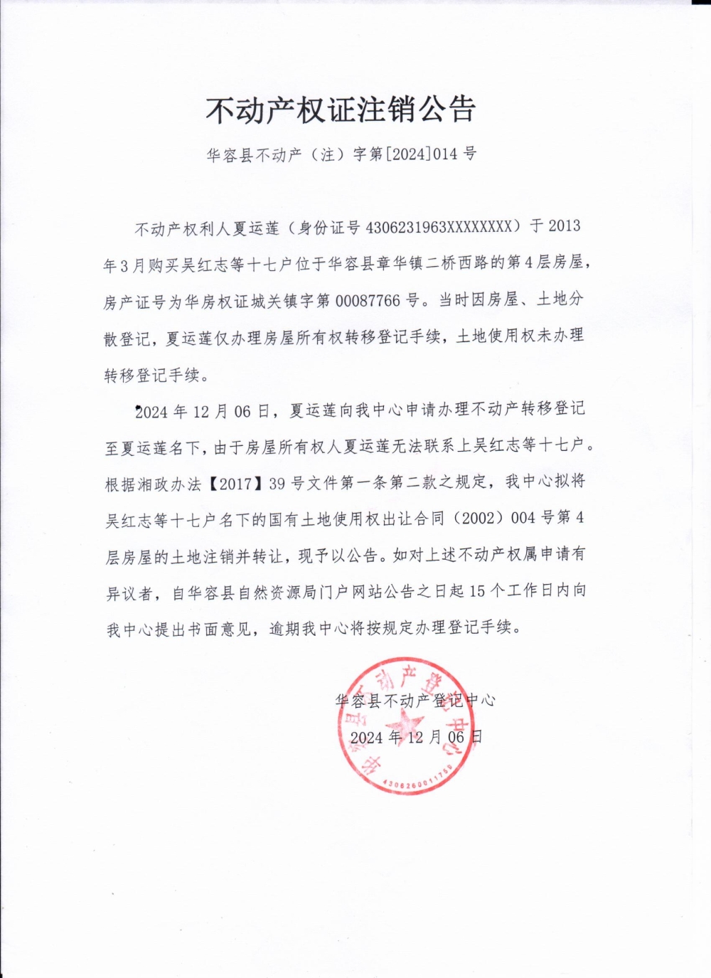 不动产权证注销公告(吴红志等十七户转夏远莲)
