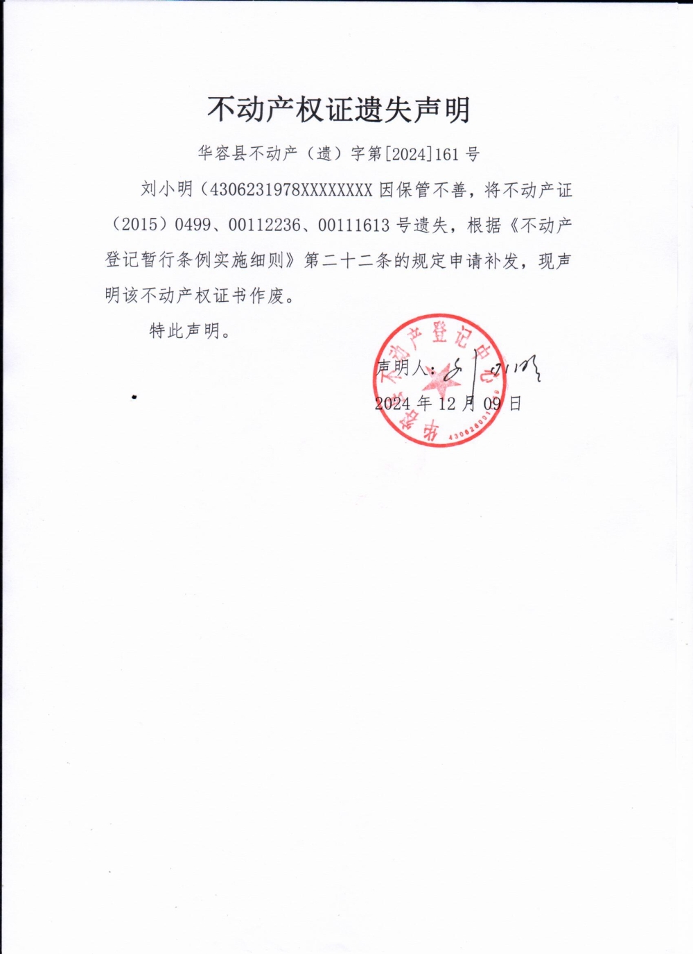 不动产权证遗失声明(刘小明)
