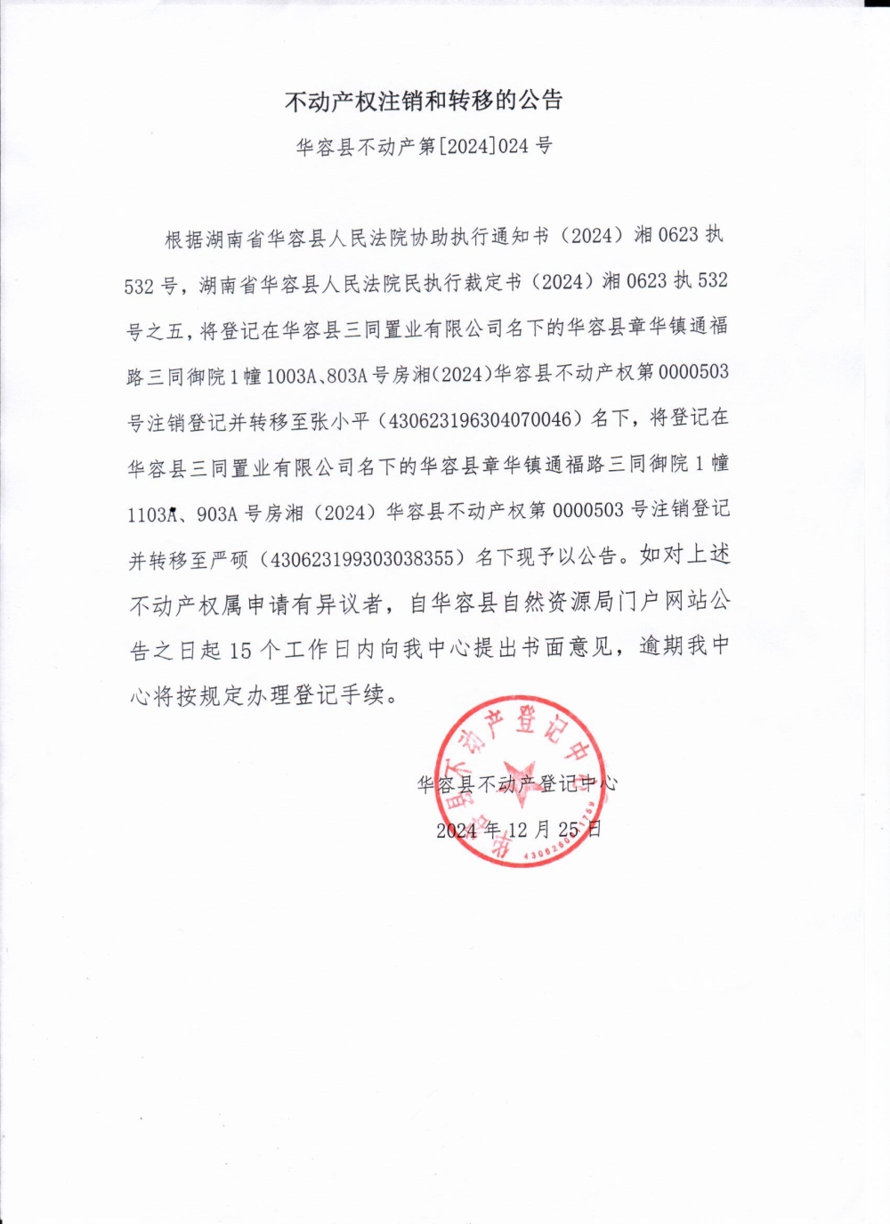 不动产权注销和转移的公告(华容县三同置业有限公司转严硕)
