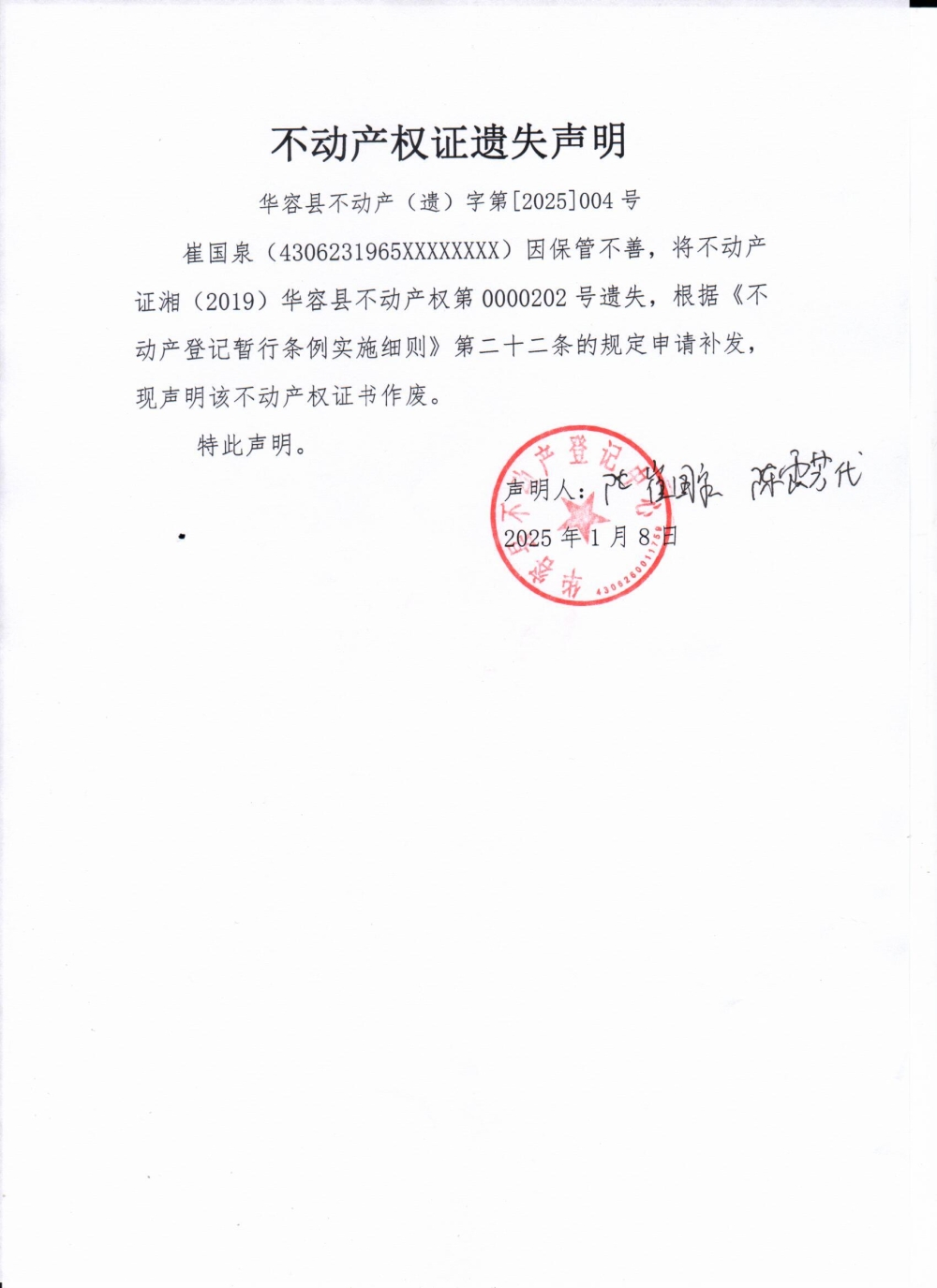 不动产权证遗失声明(崔国泉)