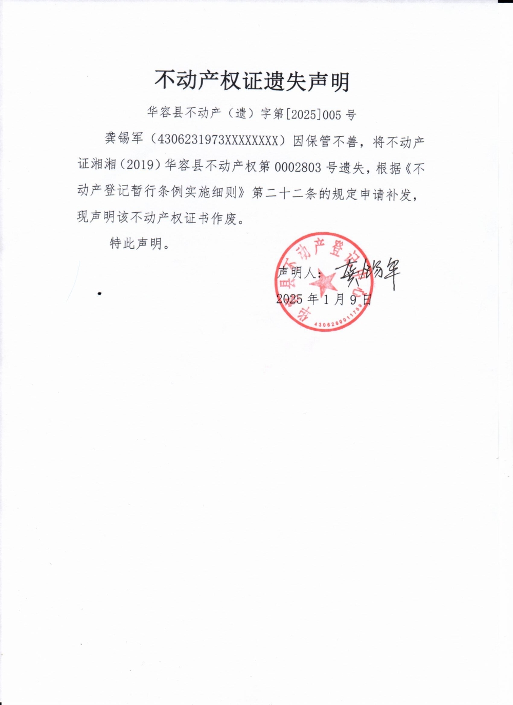 不动产权证遗失声明(龚锡军)