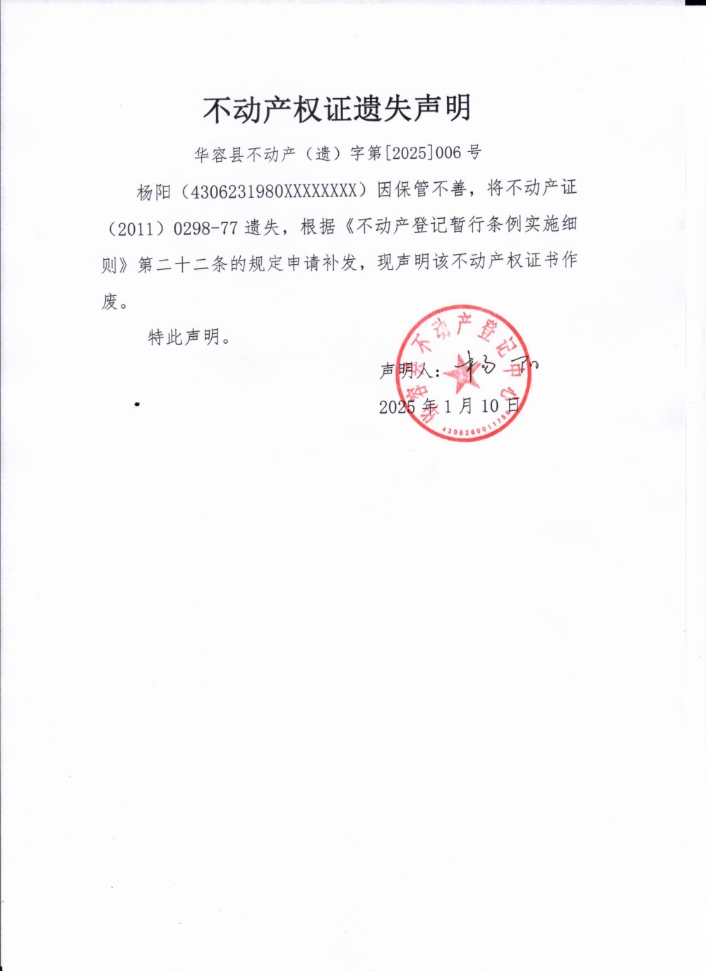 不动产权证遗失声明(杨阳)