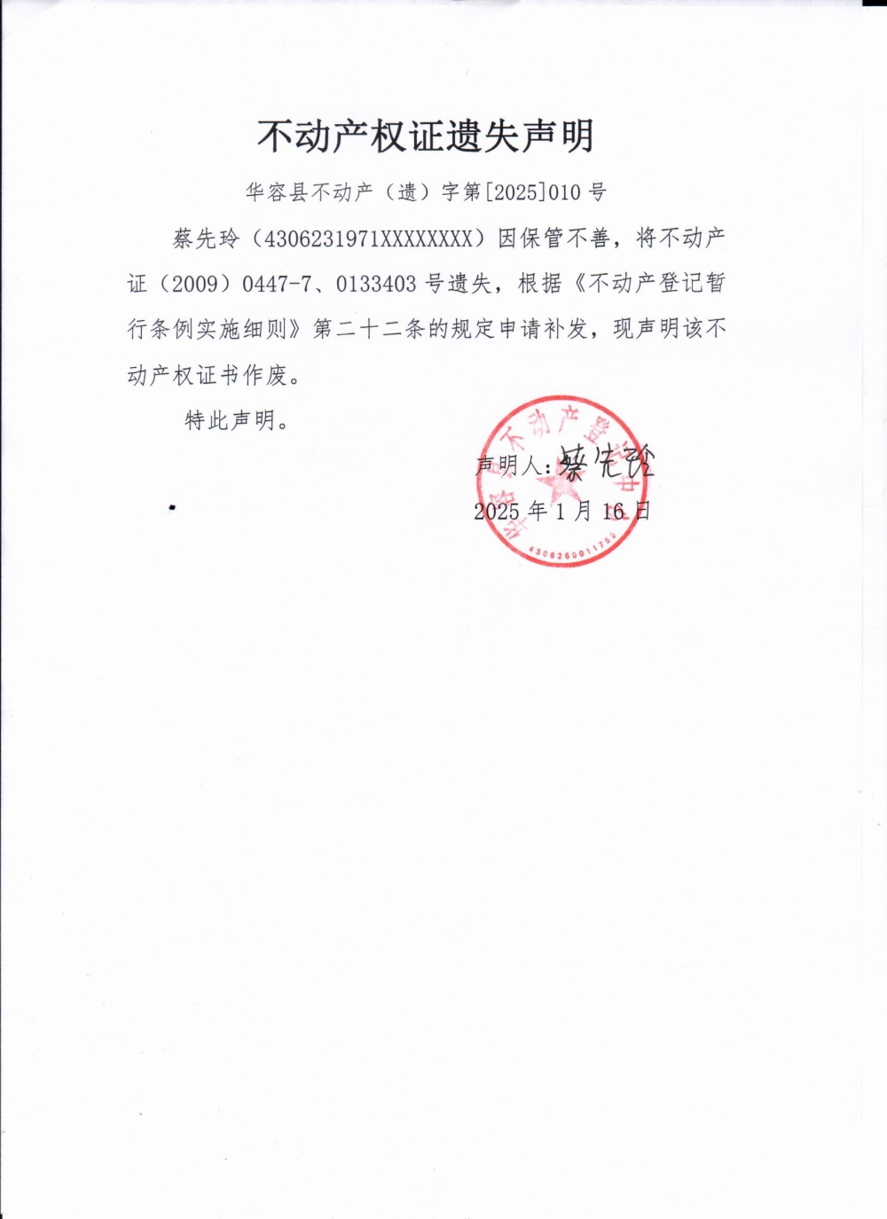 不动产权证遗失声明(蔡先玲)