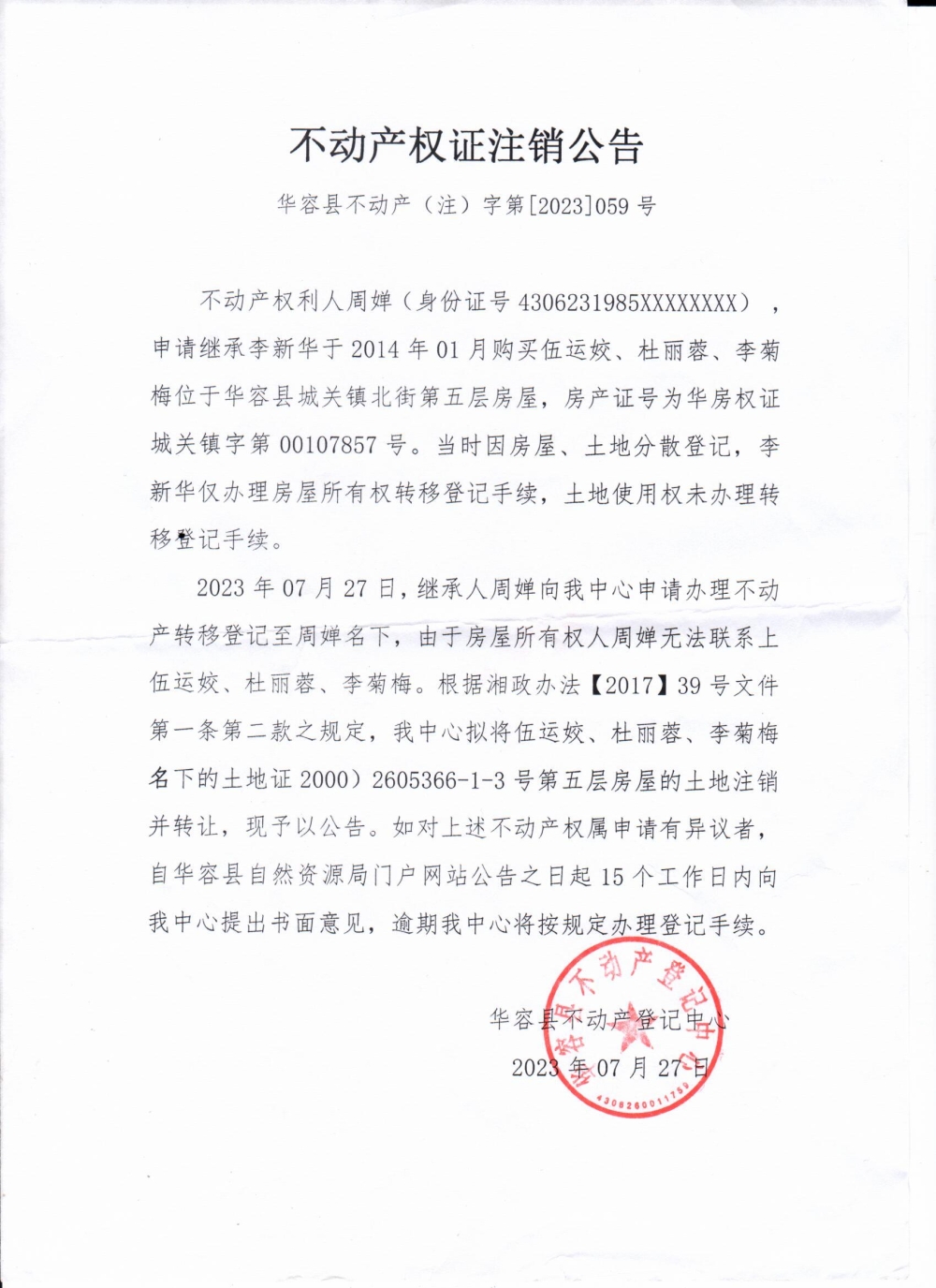 不动产权证注销公告(伍运姣、杜丽蓉、李菊梅转周婵)