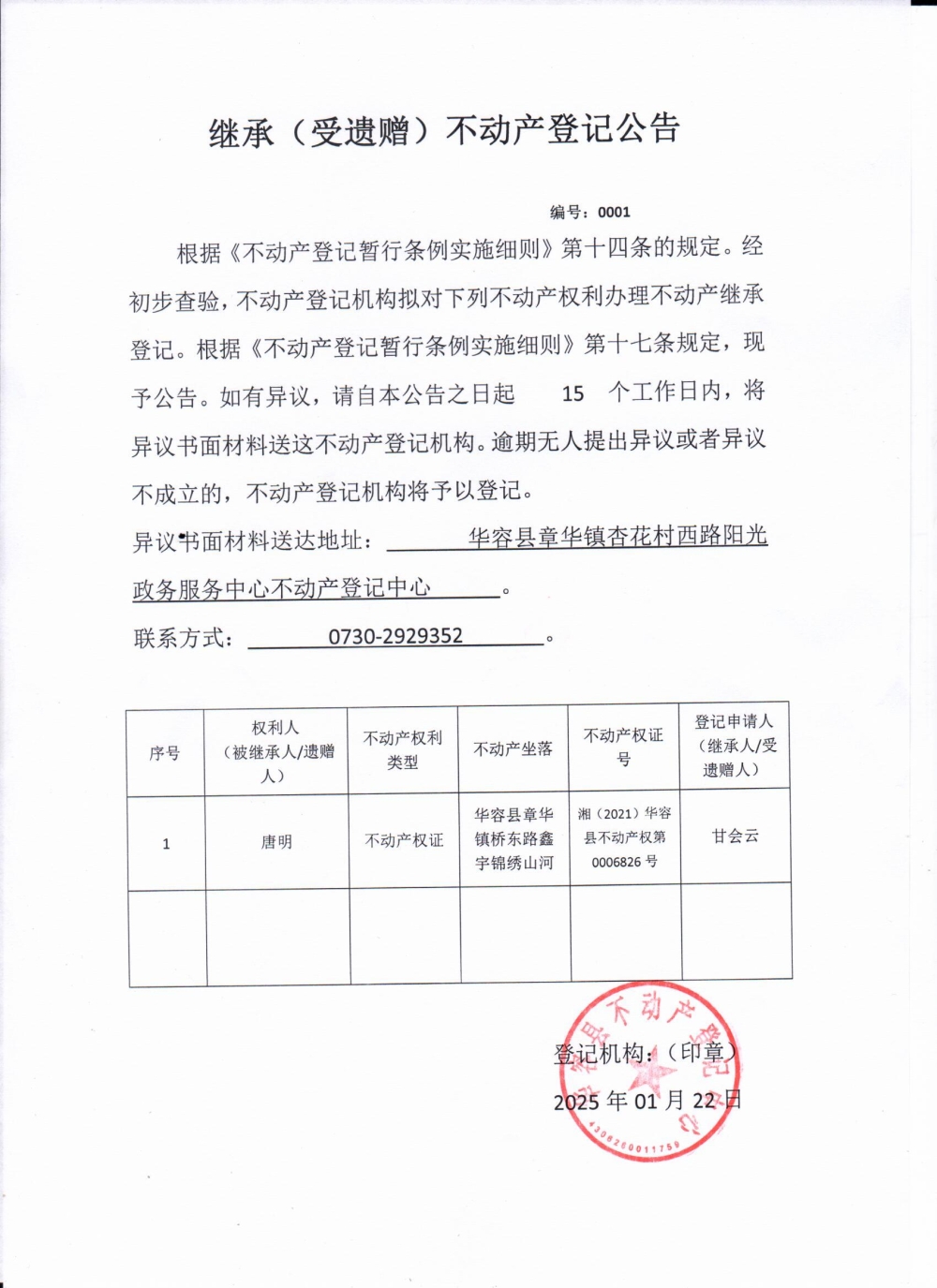 继承(受遗赠)不动产登记公告(唐明转甘会云)