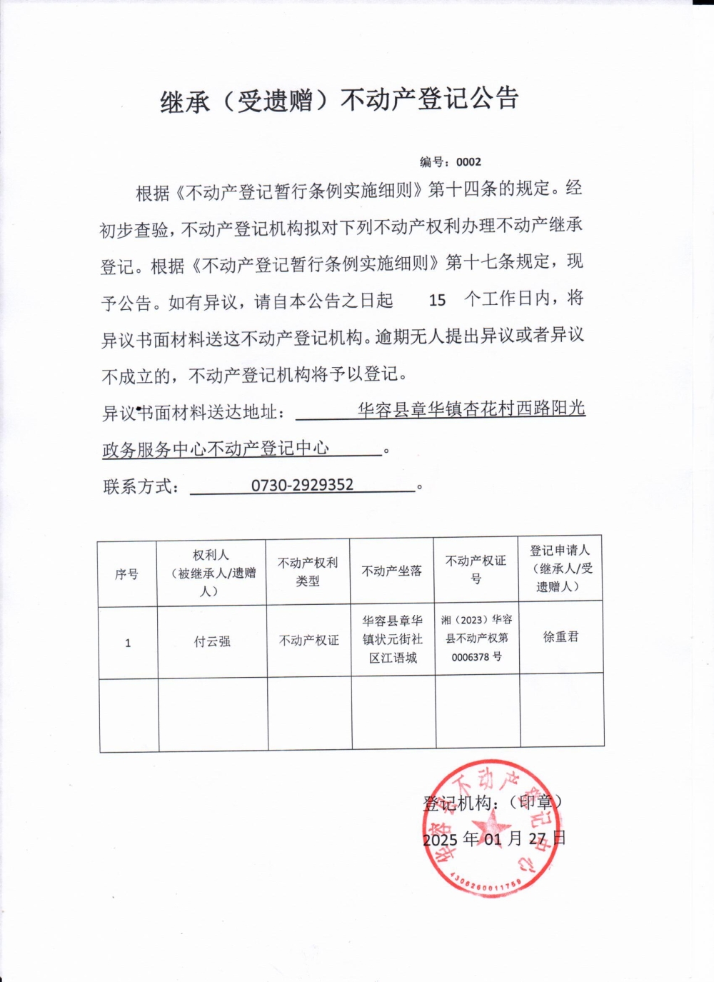 继承(受遗赠)不动产登记公告(付云强转徐重君)