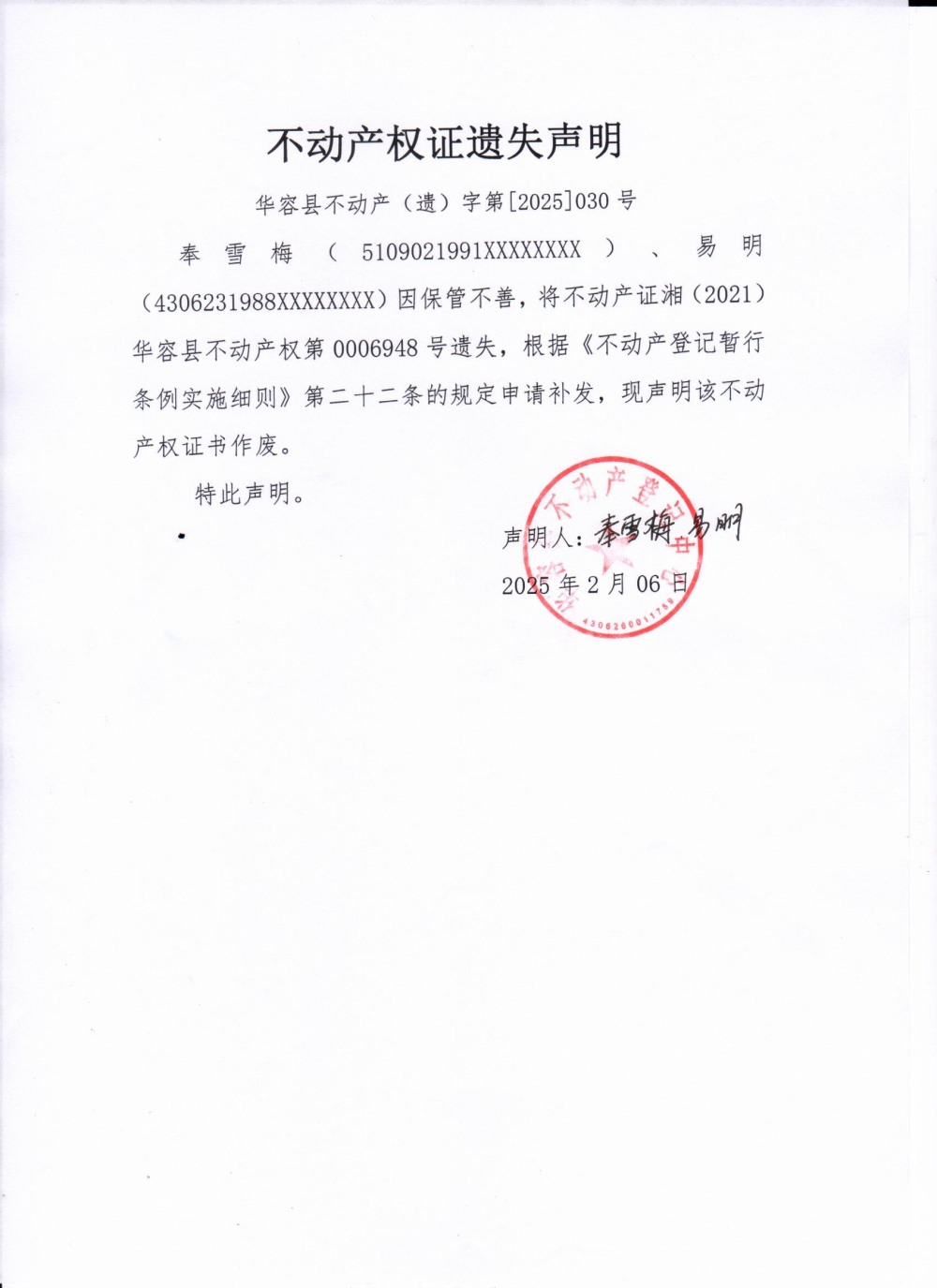 不动产权证遗失声明(奉雪梅、易明)