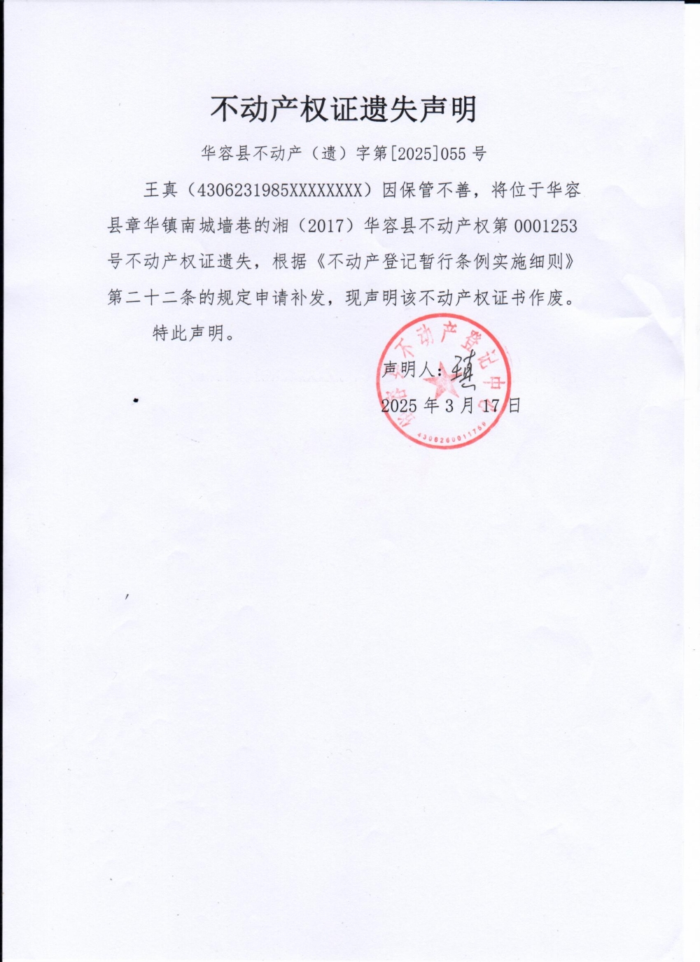 不动产权证遗失声明(王真)