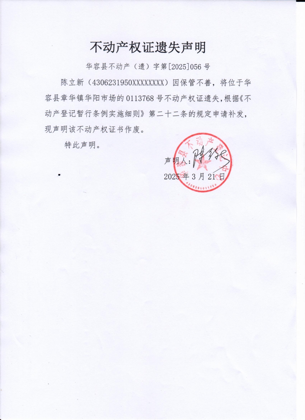 不动产权证遗失声明(陈立新)