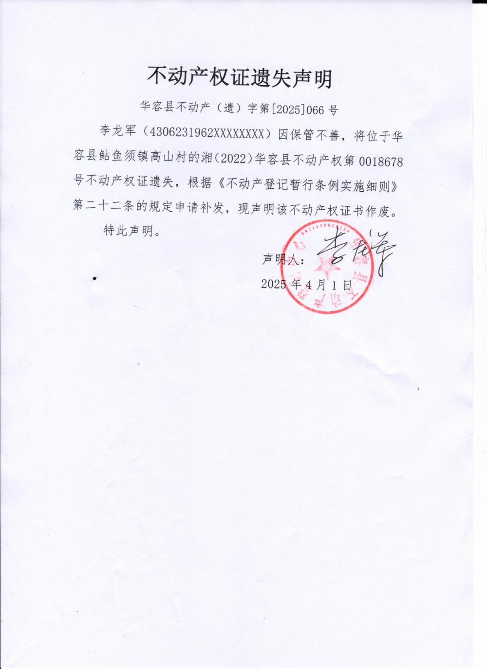 不动产权证遗失声明(李龙军)