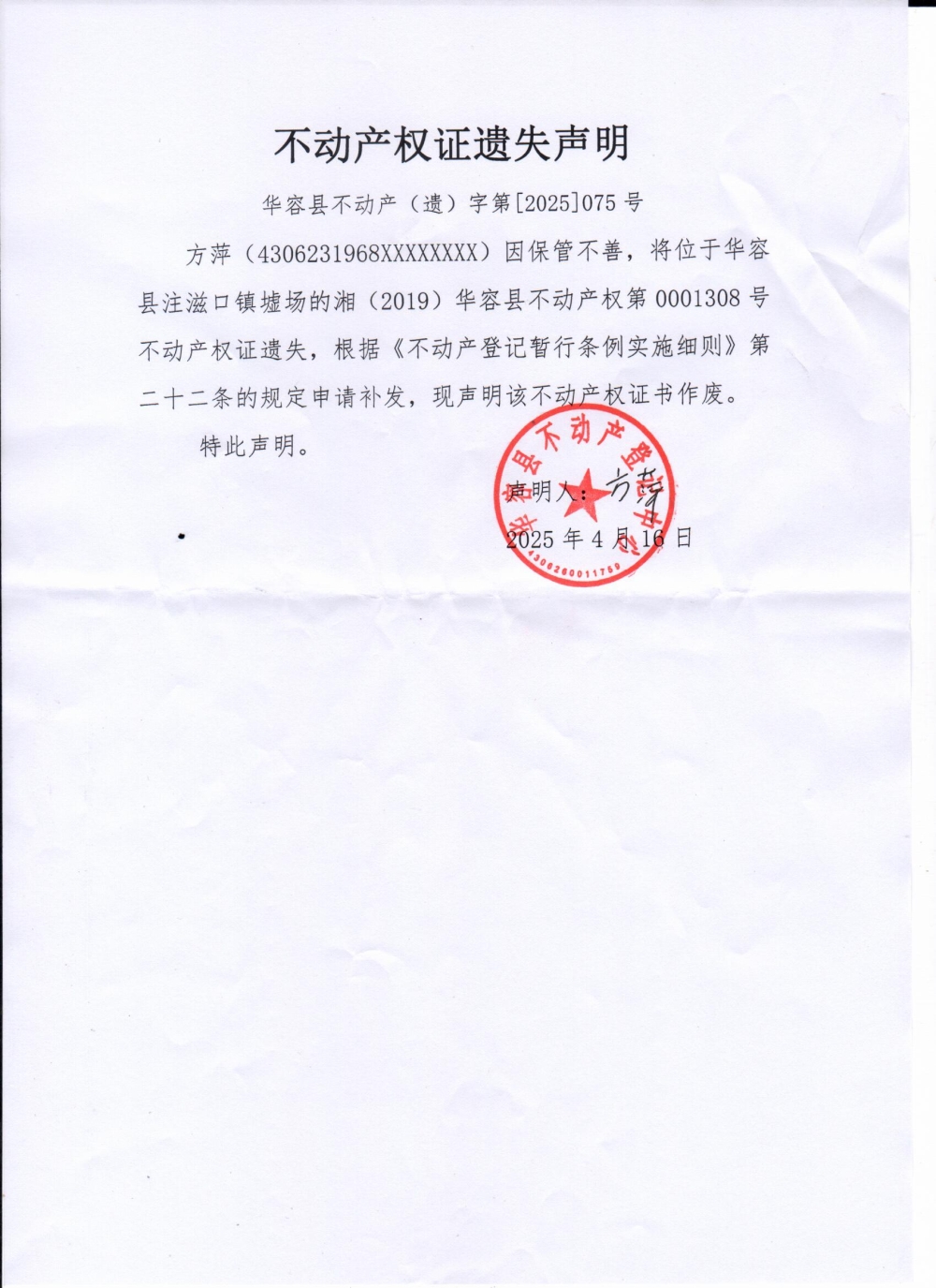 不动产权证遗失声明(方萍)