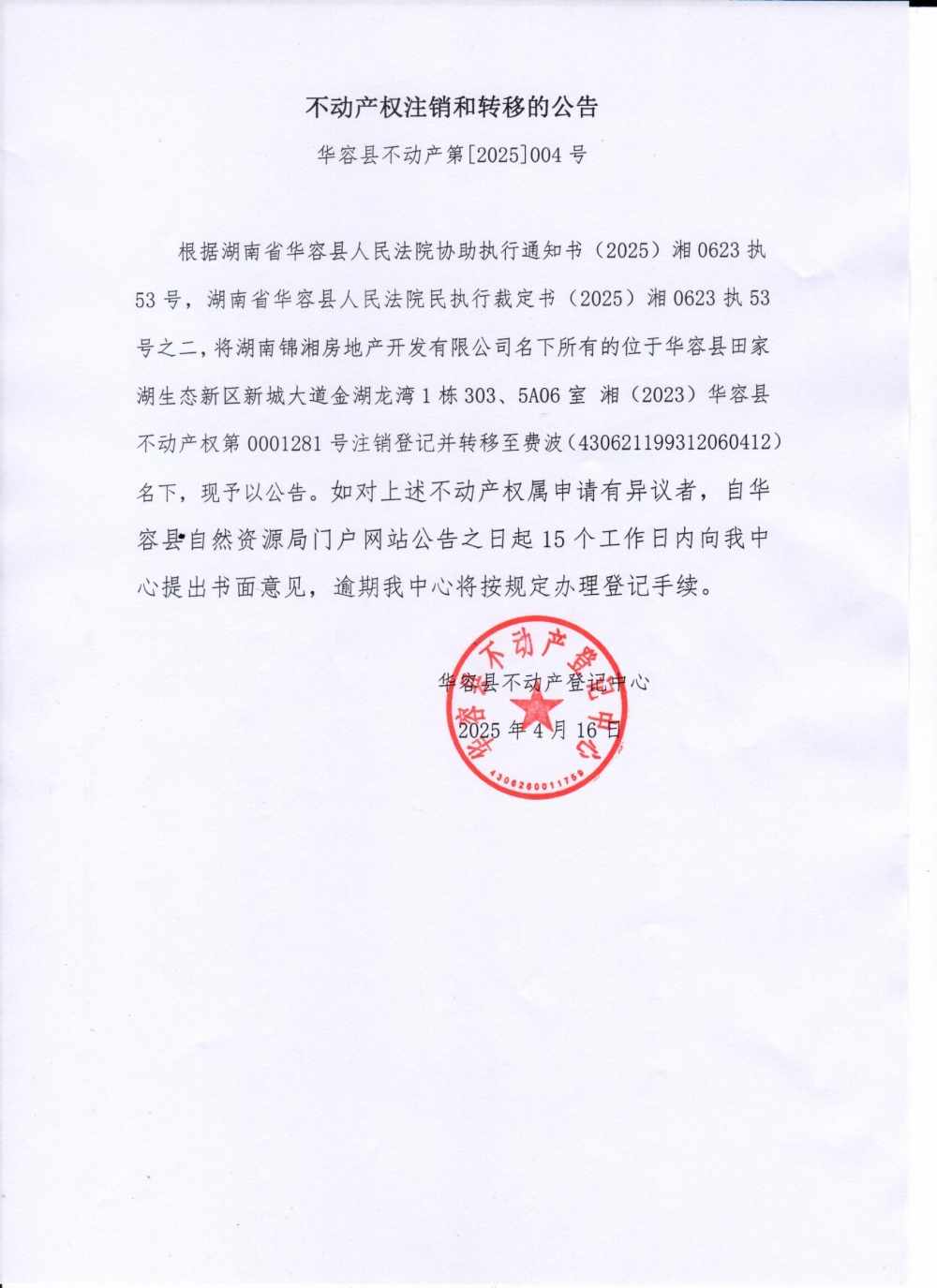 不动产权注销和转移的公告(湖南锦湘房地产开发有限公司转费波)