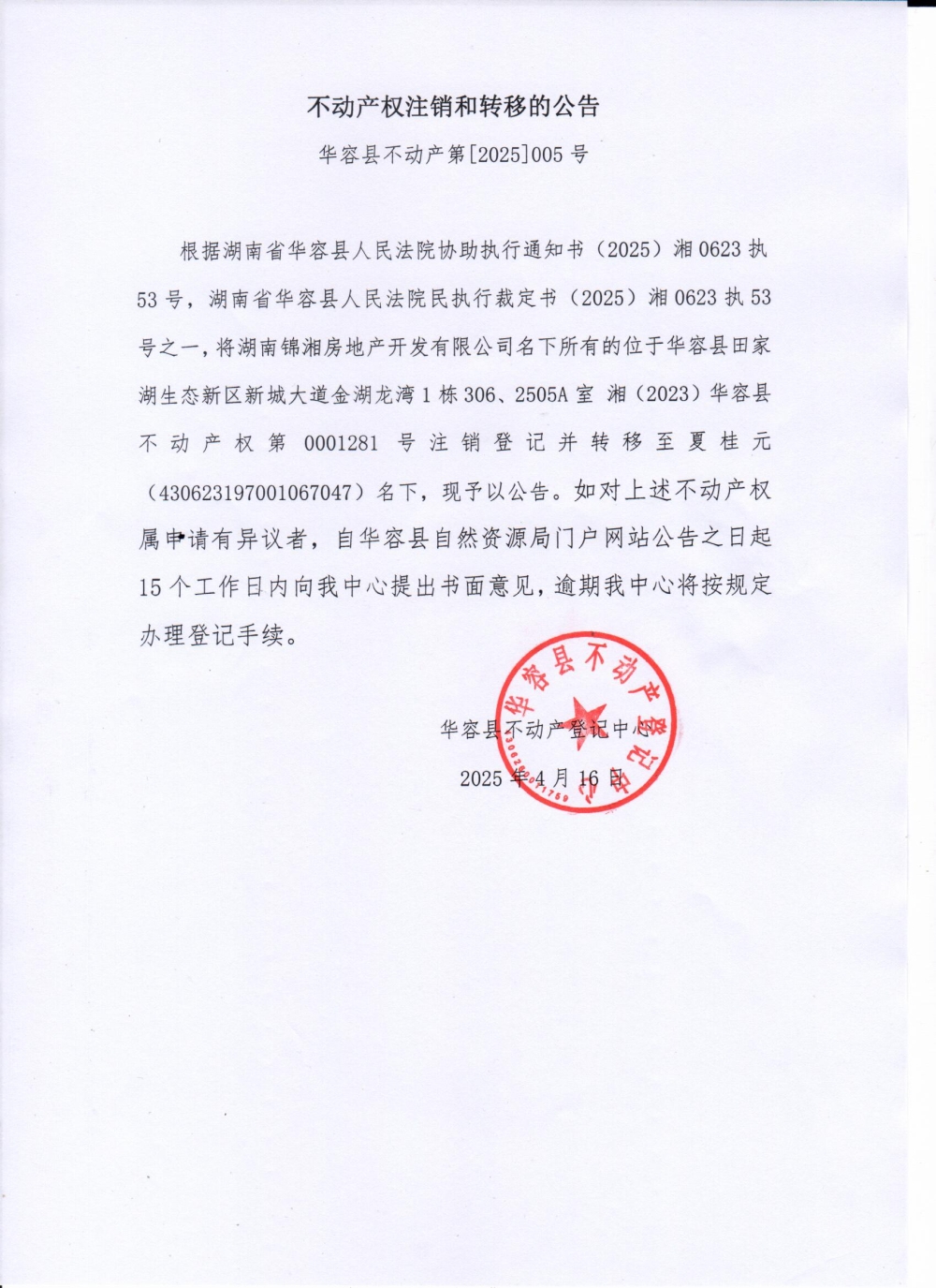 不动产权注销和转移的公告(湖南锦湘房地产开发有限公司转夏桂元)