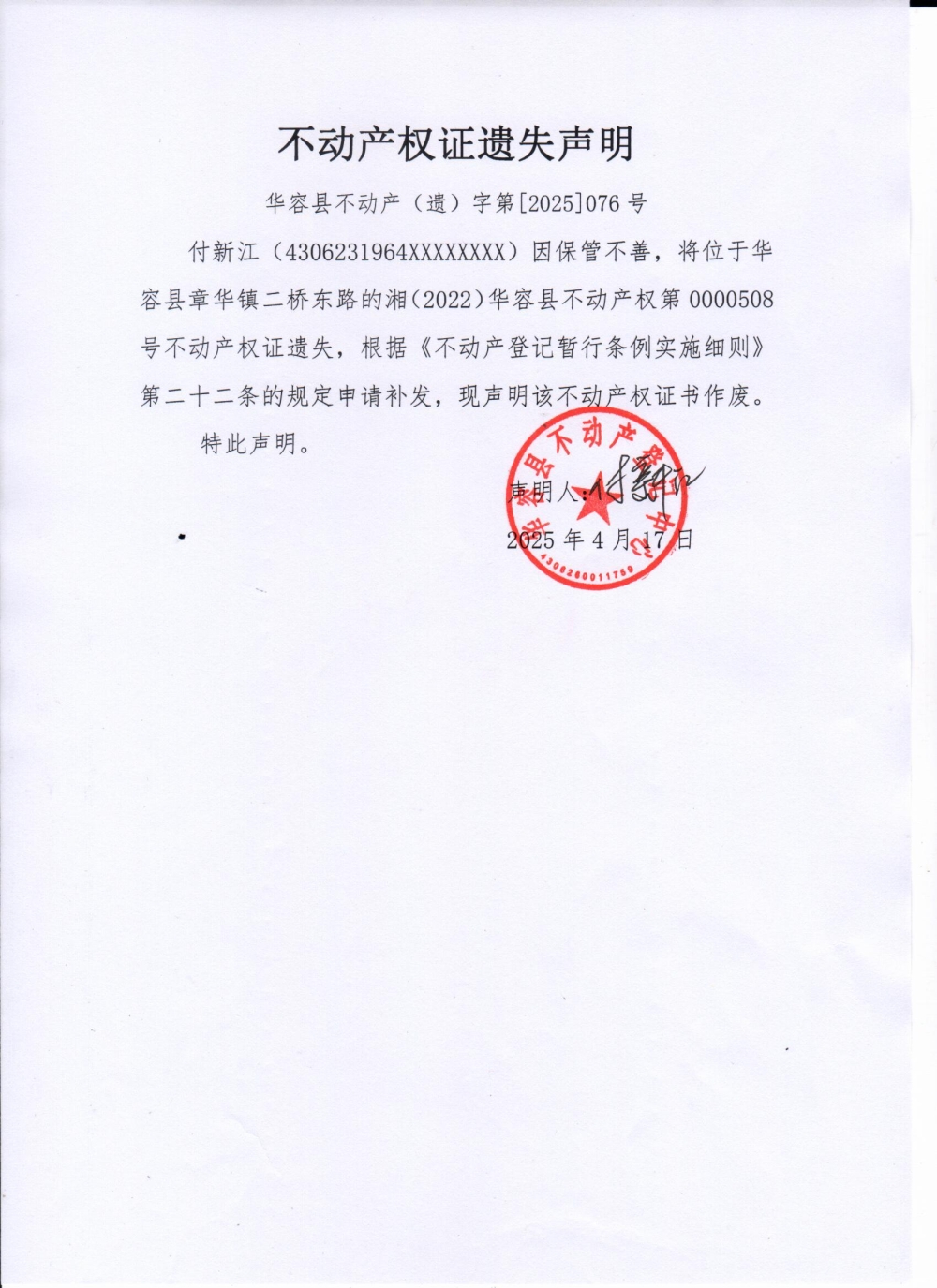 不动产权证遗失声明(付新江)