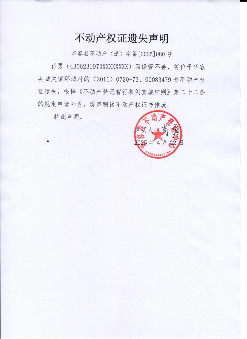 不动产权证遗失声明(肖勇)