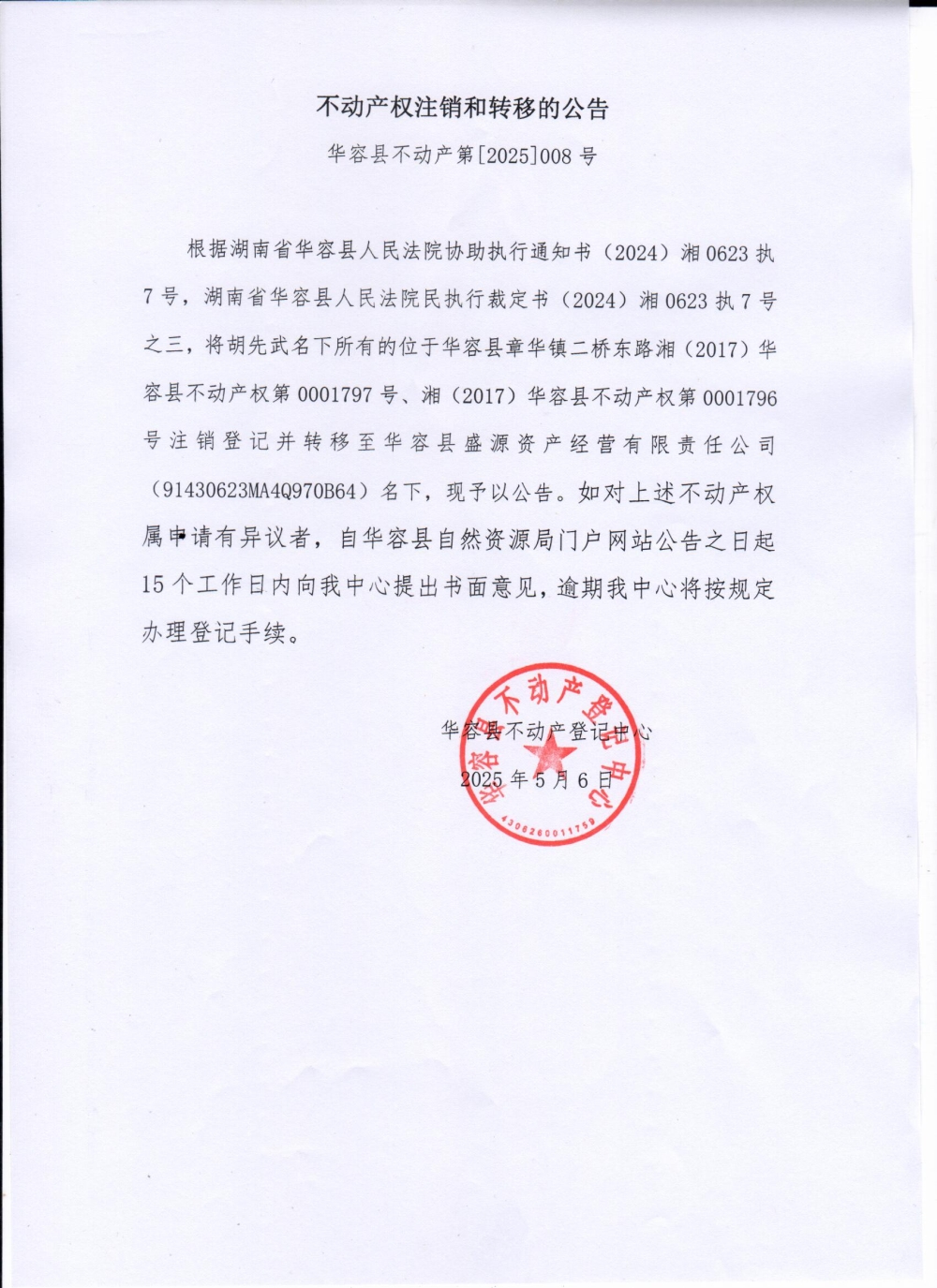 不动产权注销和转移的公告(胡先武转华容县盛源资产经营有限责任公司)
