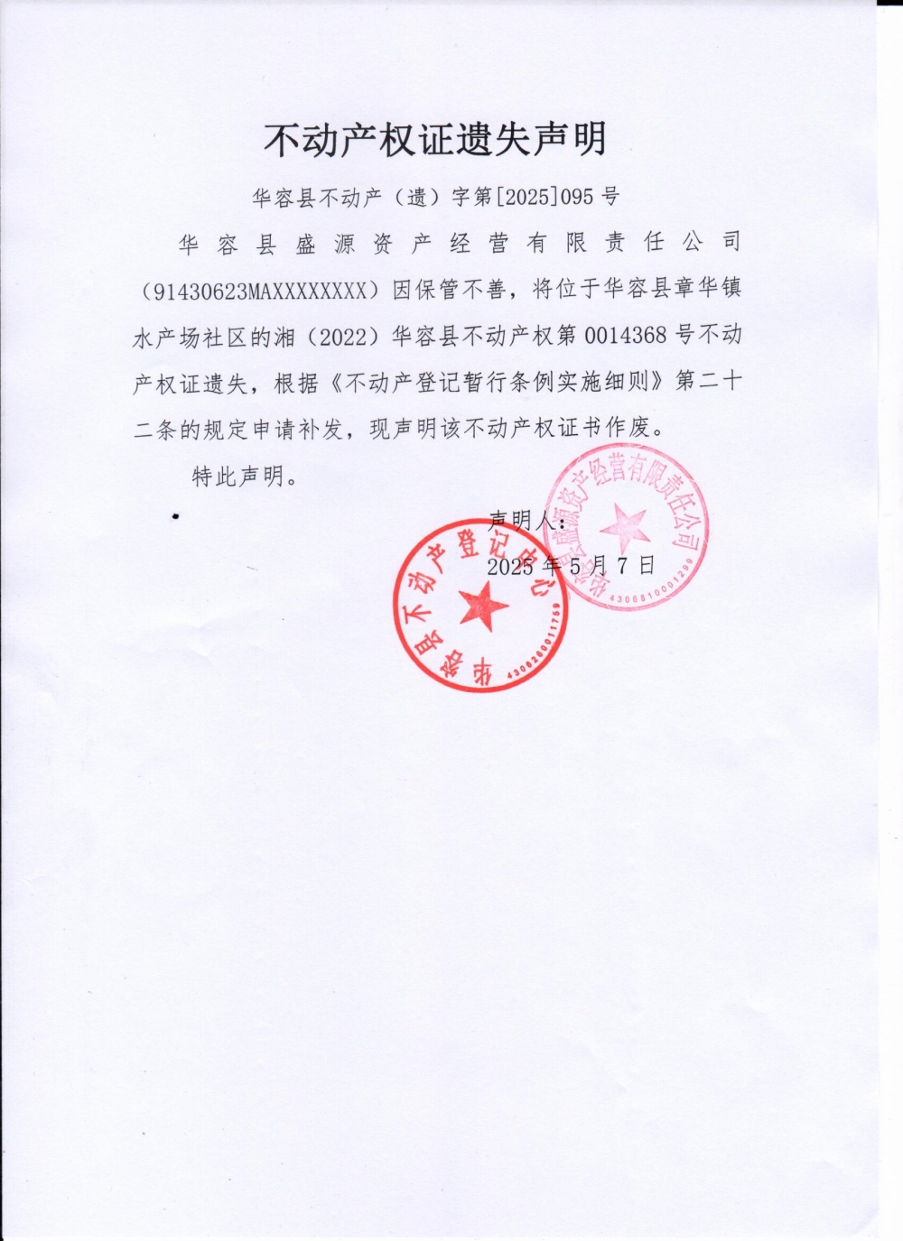 不动产权证遗失声明(华容县盛源资产经营有限责任公司)