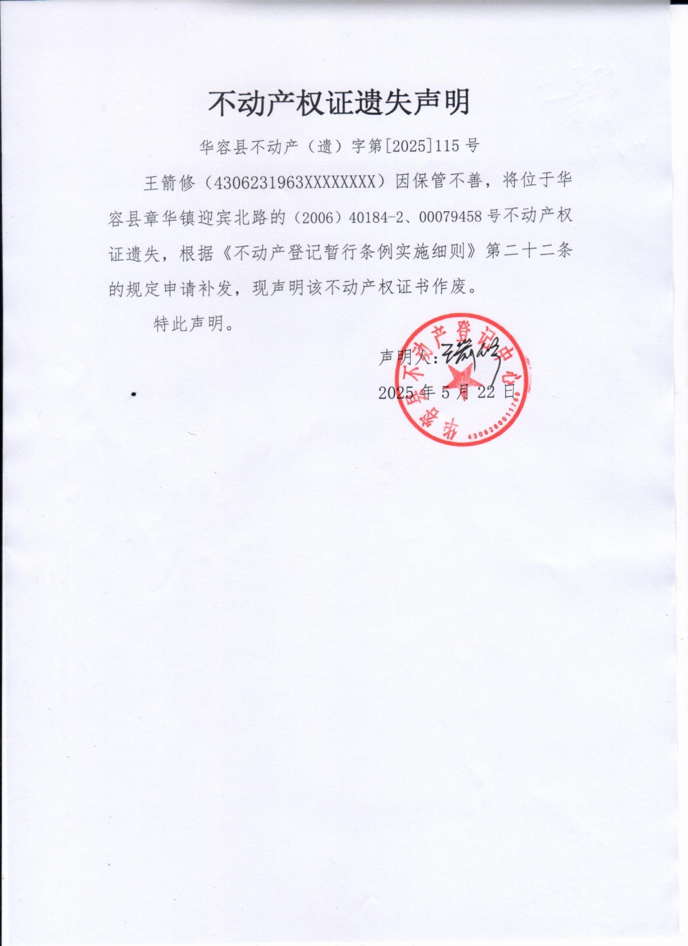 不动产权证遗失声明(王箭修)
