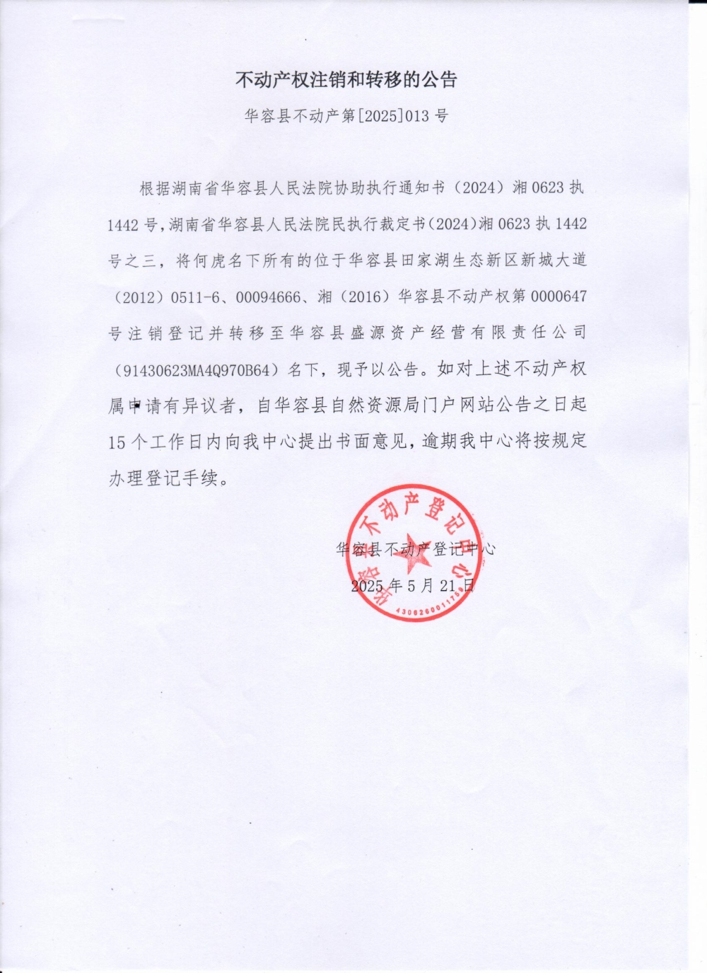 不动产权注销和转移的公告(何虎转华容县盛源资产经营有限责任公司)
