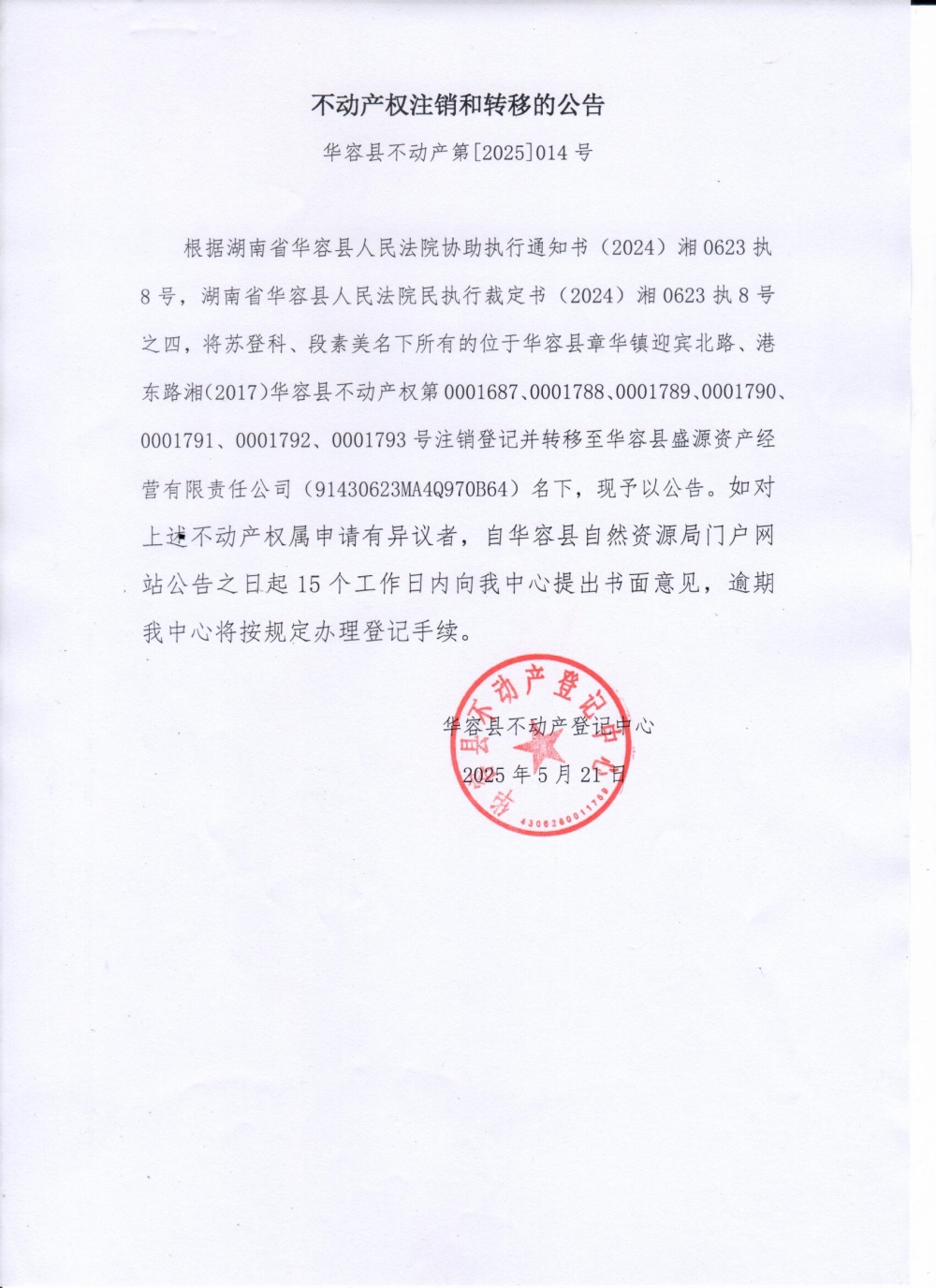 不动产权注销和转移的公告(苏等科、段素美转华容县盛源资产经营有限责任公司)