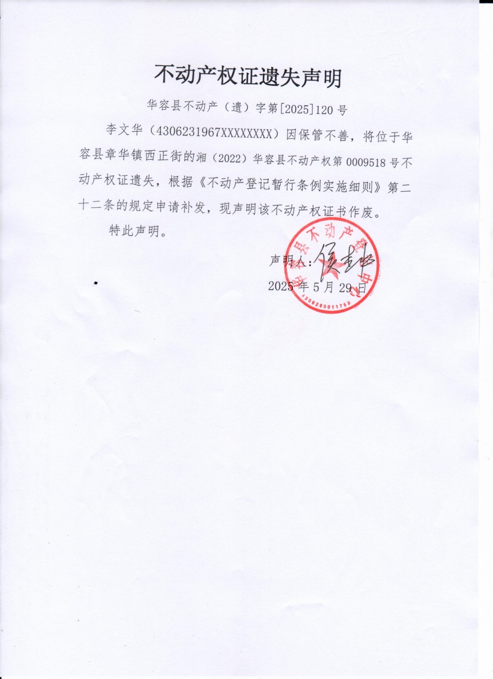 不动产权证遗失声明(李文华)