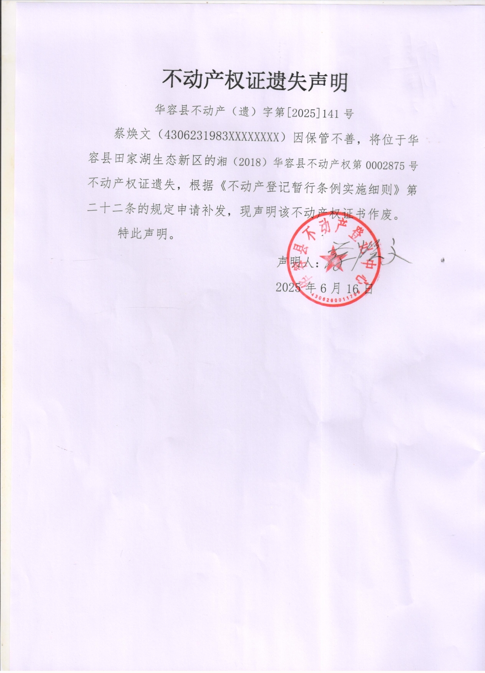 不动产权证遗失声明(蔡焕文)