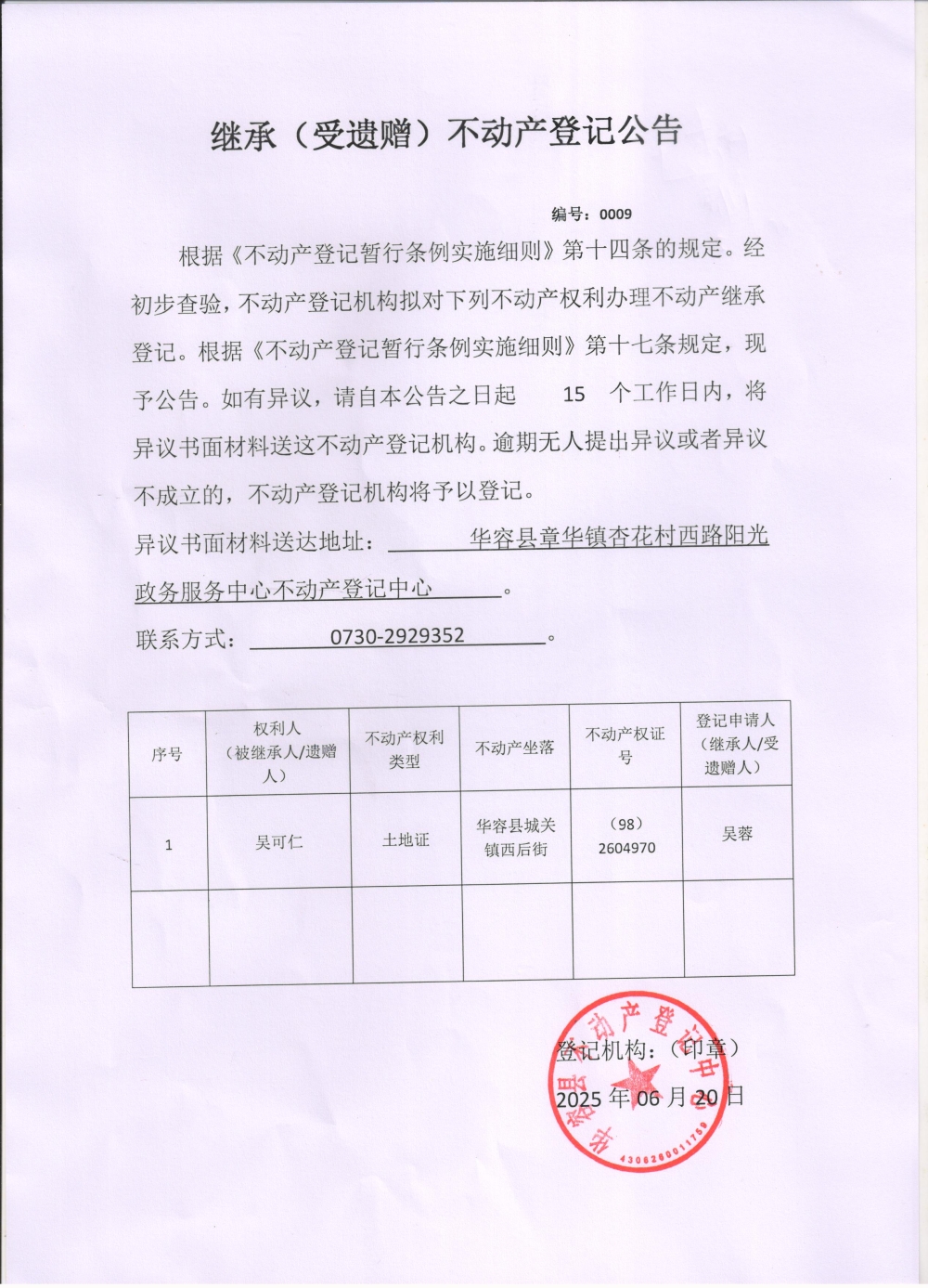 继承(受遗赠)不动产登记公告(吴可仁转吴蓉)