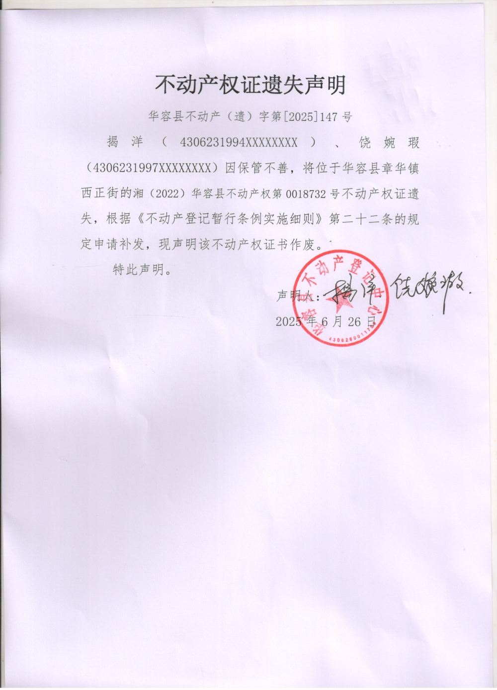 不动产权证遗失声明(揭洋 饶婉瑕)