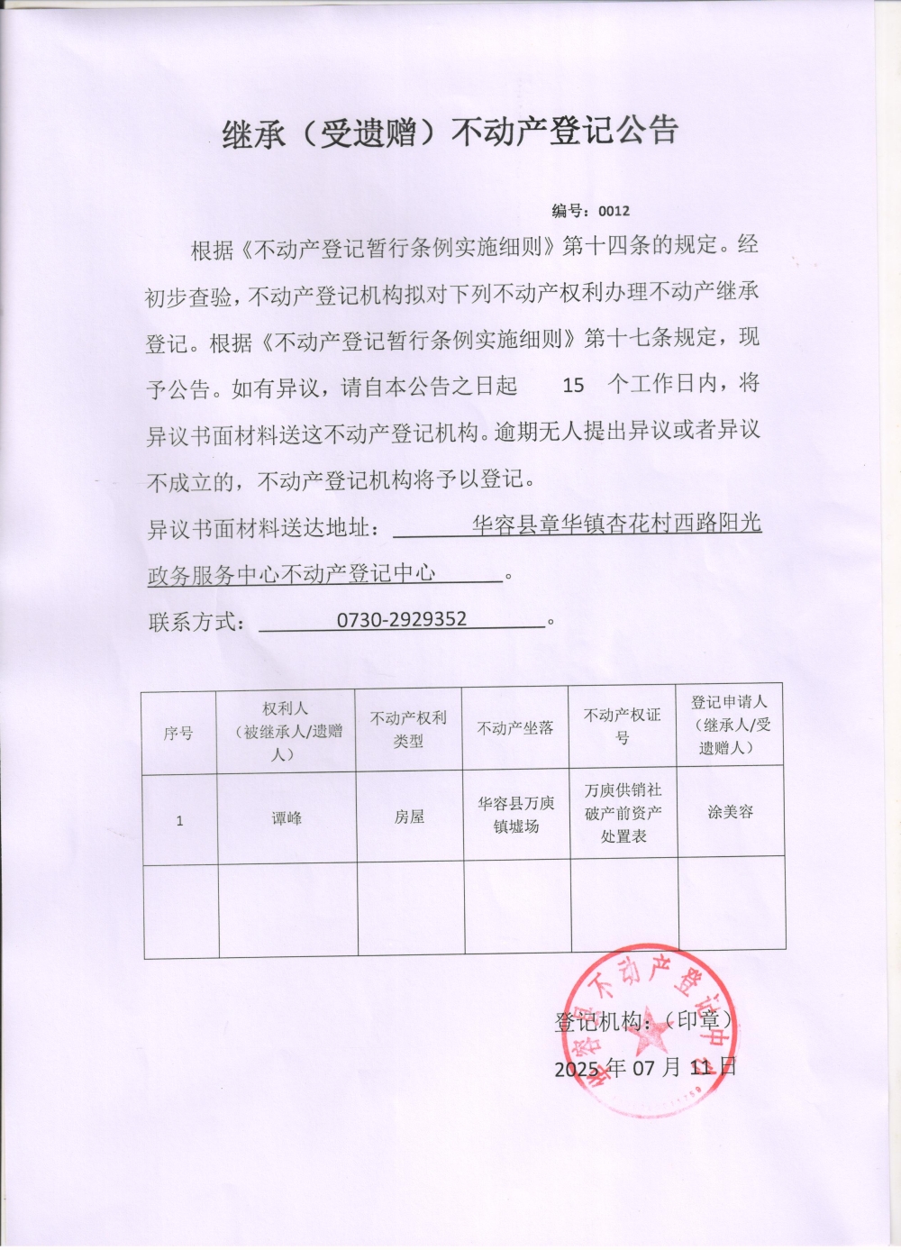 继承(受遗赠)不动产登记公告(谭峰转涂美容)
