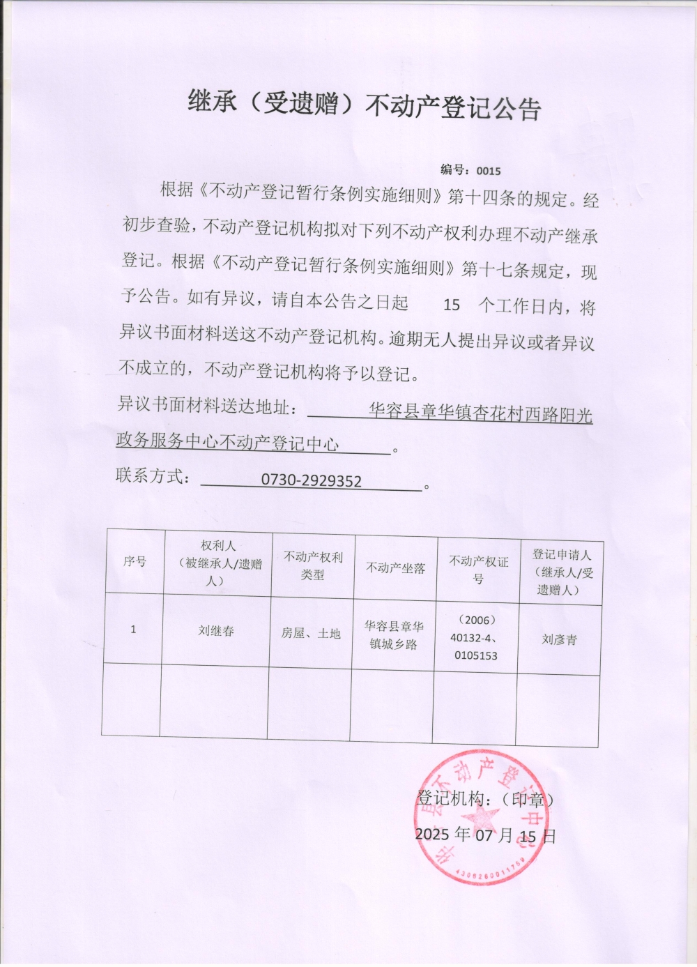 继承(受遗赠)不动产登记公告(刘继春转刘彦青)